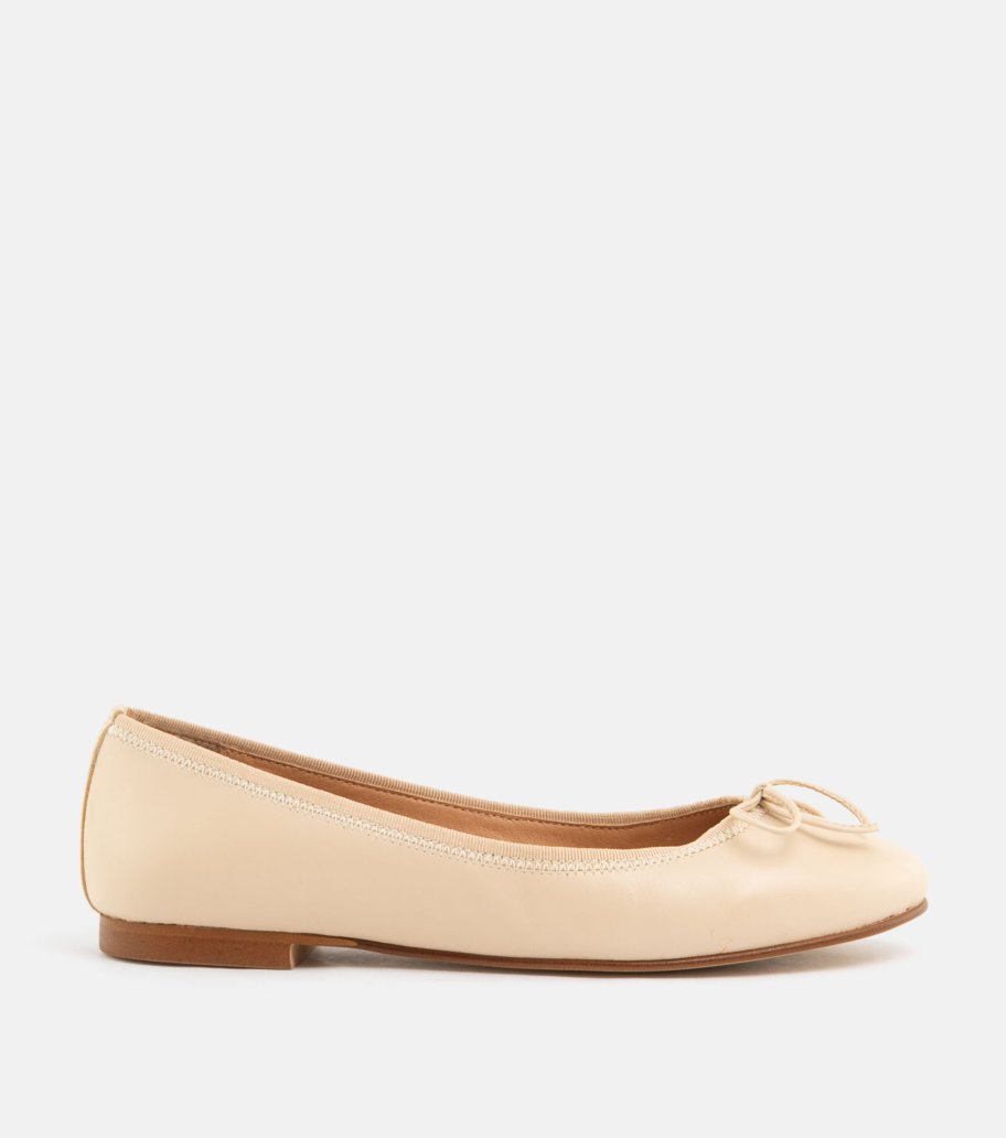 Bailarina de Botticelli en color beige. Fabricada en piel napa de alta calidad con acabado liso. Detalle de lazo fino en el empeine y forro interior en piel. Suela fina flexible y tacón de 1 cm. Fabricada en España, perfecta para un estilo elegante