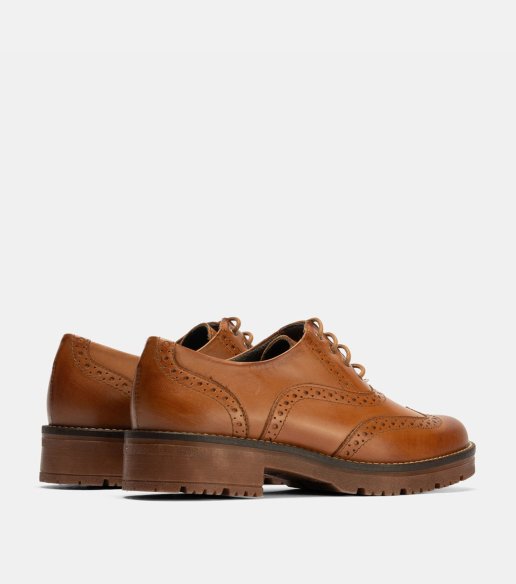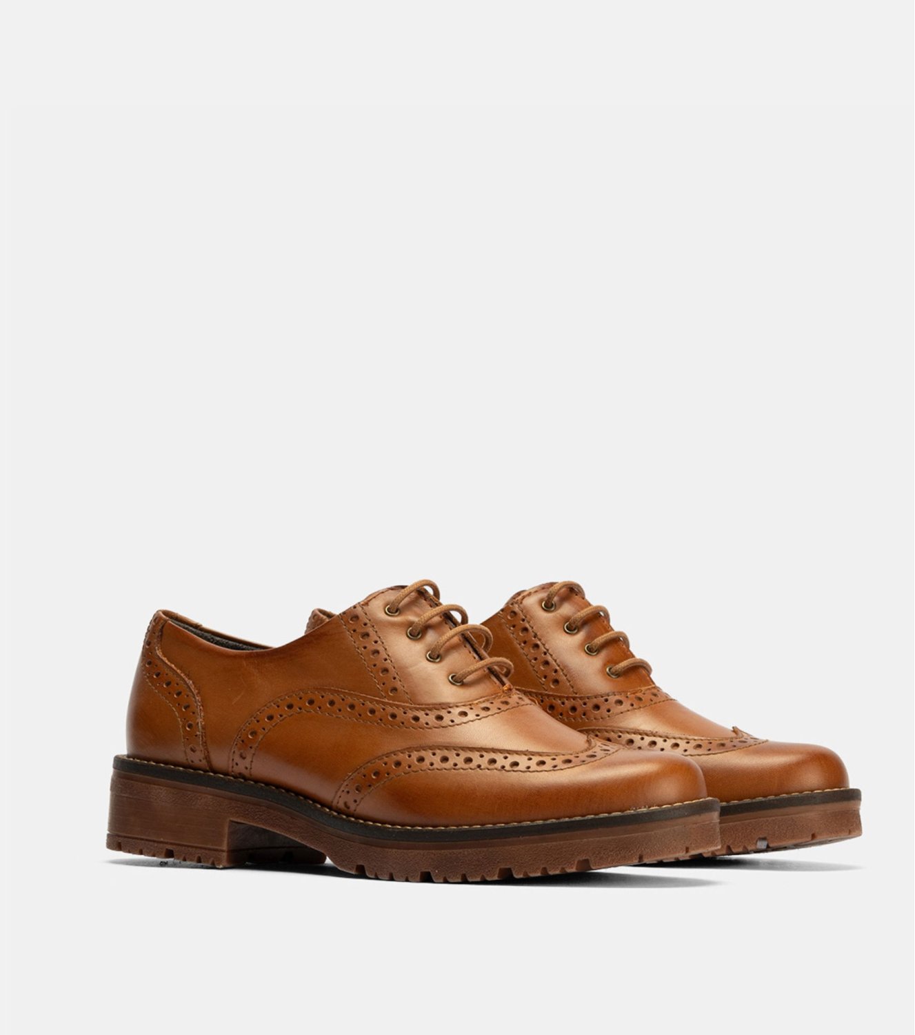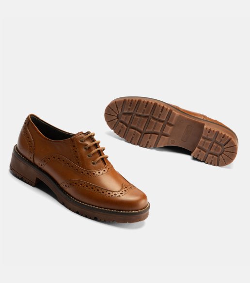 Blucher Pitillos en color cuero fabricado en piel de alta calidad. Diseño clásico con punteado decorativo tipo inglés, cierre de cordones y suela dentada con tacón medio. Un zapato elegante, resistente y cómodo para diario