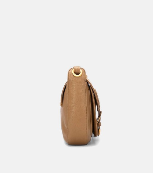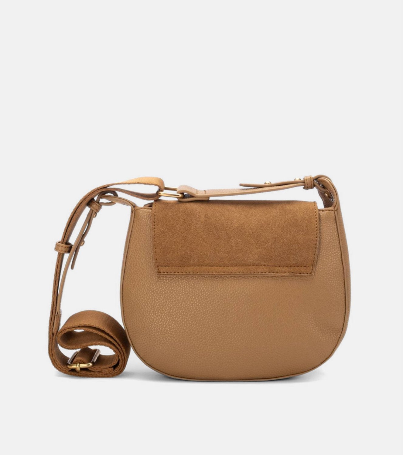 Bolso Carmela en color camel confeccionado en piel serraje con acabado suave y estructura compacta. Diseño con solapa frontal y cierre seguro, acompañado de asa regulable para llevar al hombro o cruzado. Un modelo versátil. Medidas: 24 x 32 x 11 cm