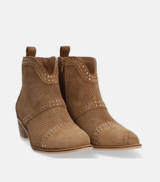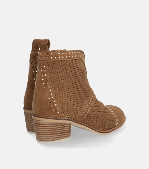 Botín Alpe en color cuero fabricado en piel serraje, con detalle de tachuelas y microperfarados. Caña baja con cierre de cremallera lateral que facilita el calce y aporta comodidad. Un modelo versátil, ideal para entretiempo. Fabricado en España