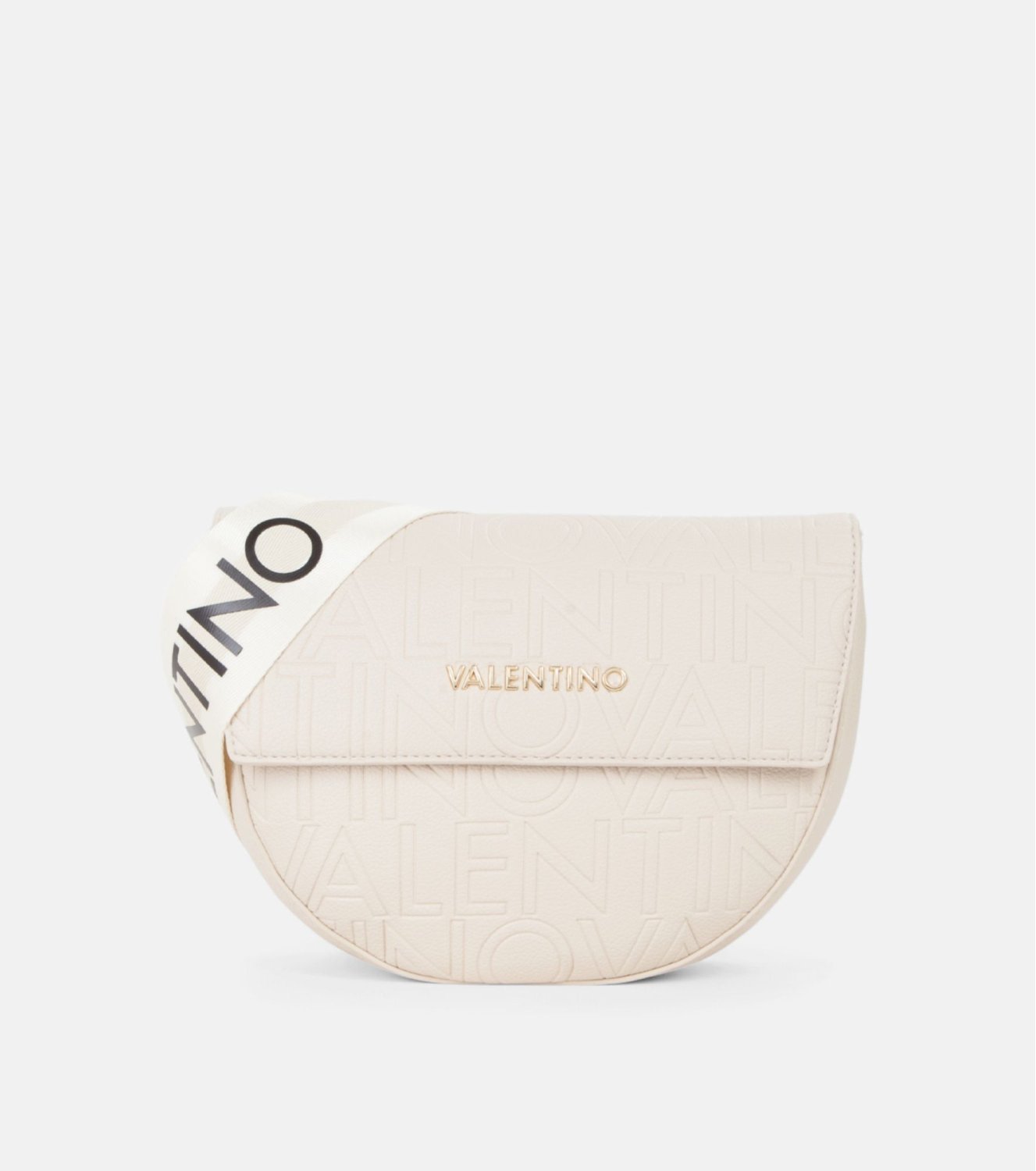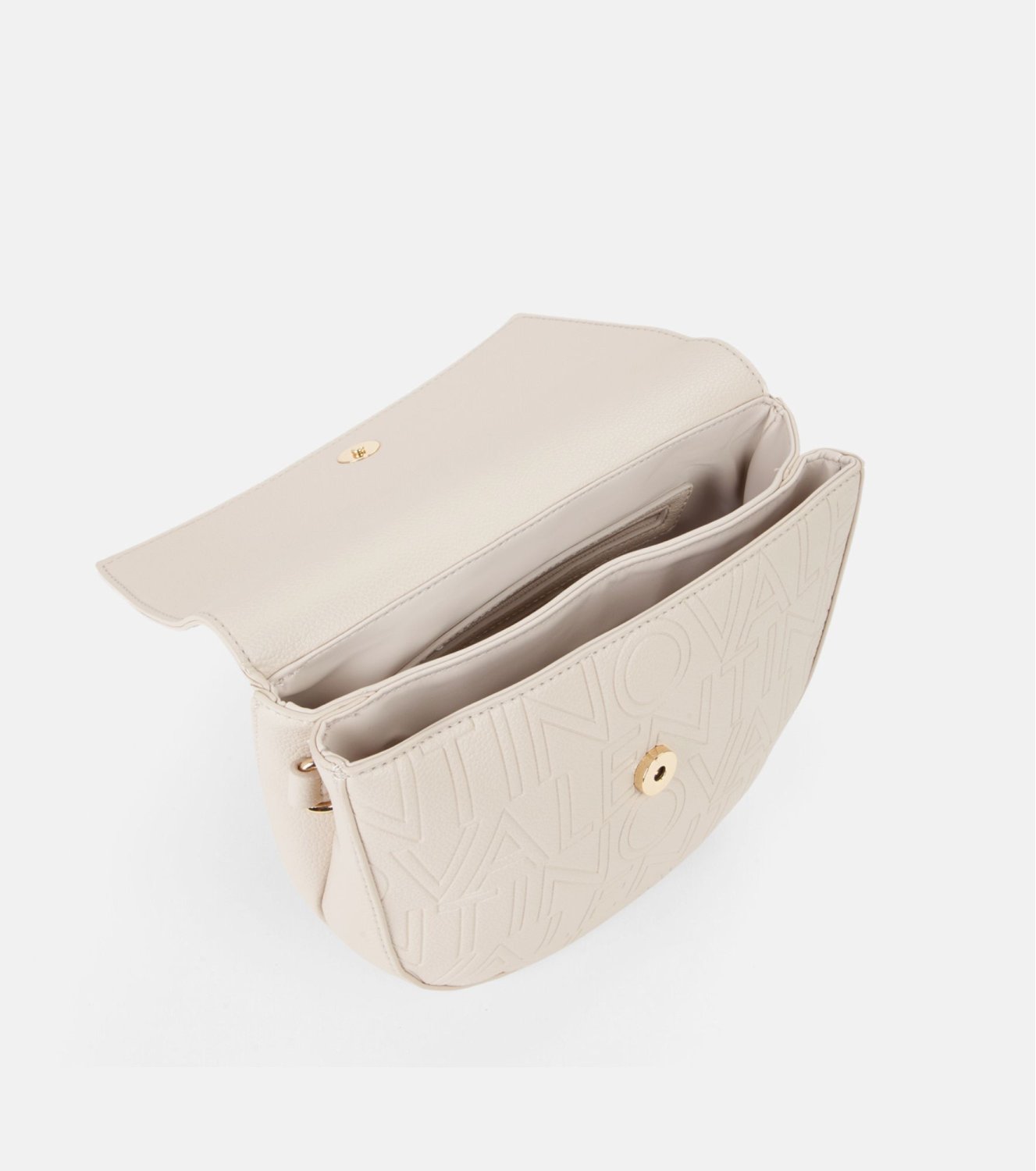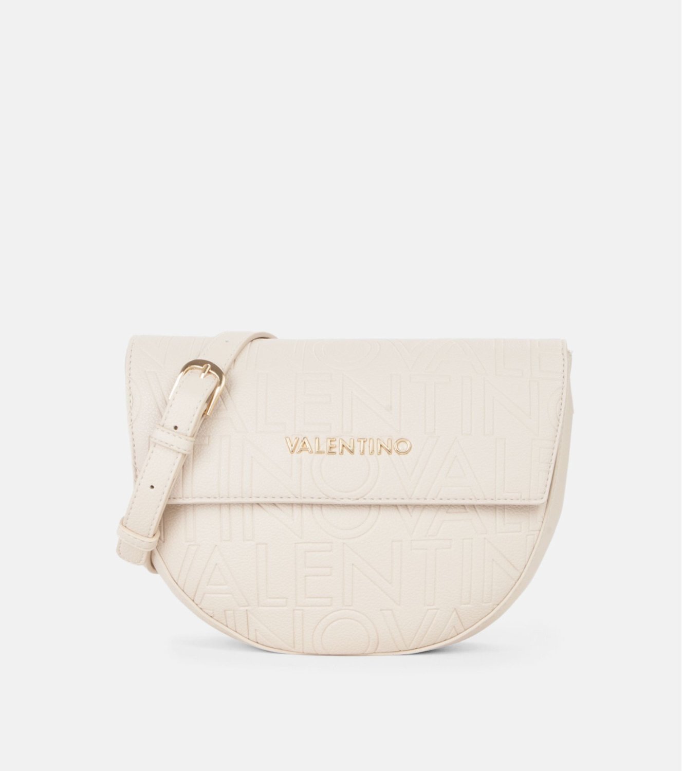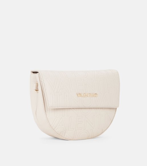Bolso Valentino Pansy en beige. Diseño en material sintético texturizado y logo grabado. Incorpora correa regulable y cierre con solapa imantada. ara llevar al hombro o cruzado. Interior organizado en dos compartimentos. Medidas: 19 x 24 x 8 cm.