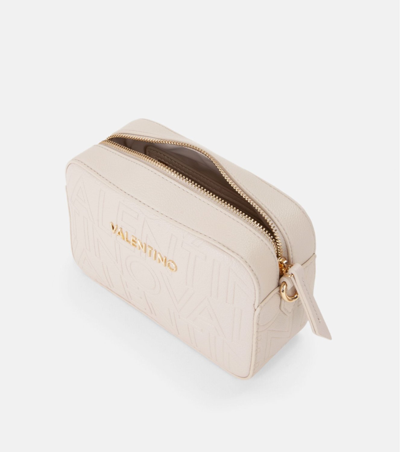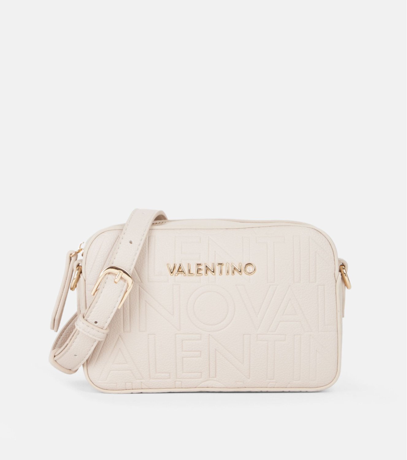 Bolso bandolera Valentino Pansy en beige. Fabricado en material sintético con textura granulada y detalle de logo en. Cuenta con cierre superior mediante cremallera y correa regulable. Medidas: 13 × 20 × 5 cm.