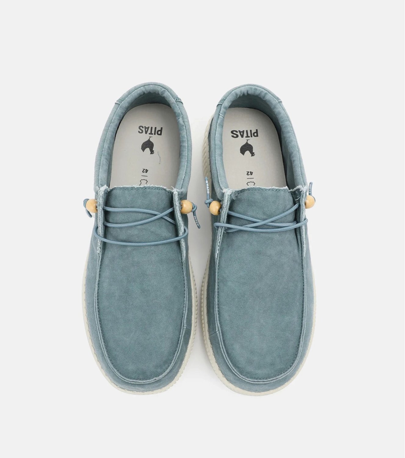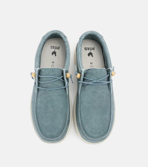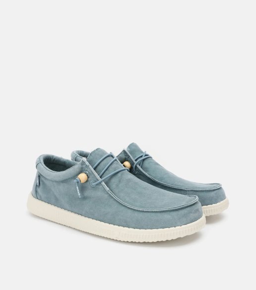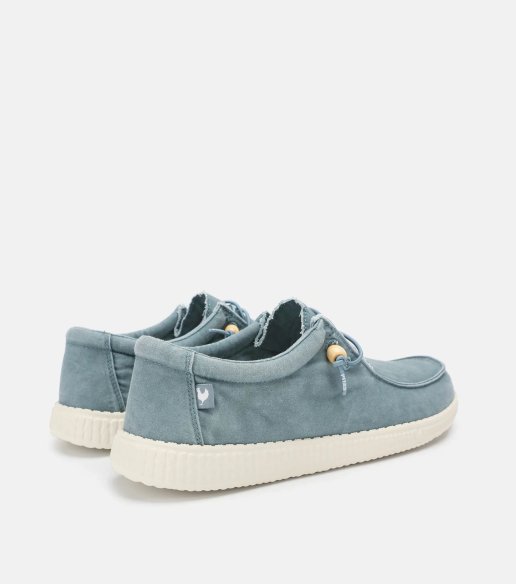 Wallabee Walk in Pitas en lona canvas color azul turquesa con acabado lavado. Diseño ultraligero con suela flexible y plantilla extraíble que aporta comodidad en el uso diario. Elásticos en el empeine para un ajuste rápido y sencillo.