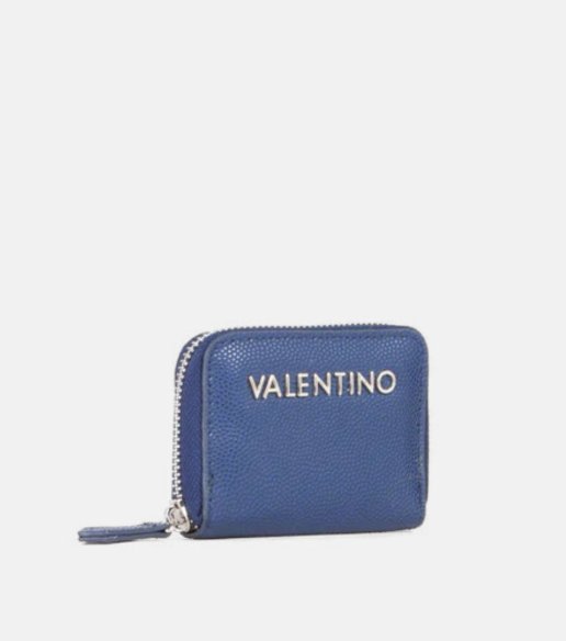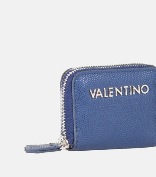 Cartera Valentino en color azul, con diseño compacto y funcional. Confeccionada en material efecto piel con textura granulada y logo metálico. Cierre de cremallera perimetral. Interior con compartimentos múltiples. Medidas: 7,5 x 10 x 1,8 cm.