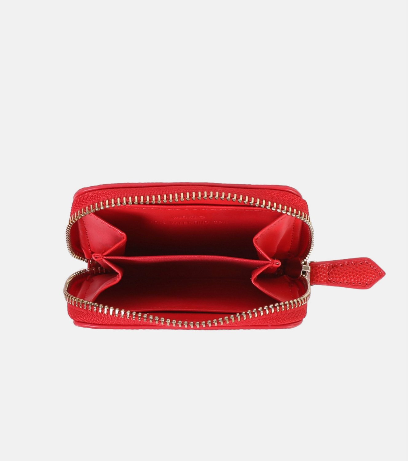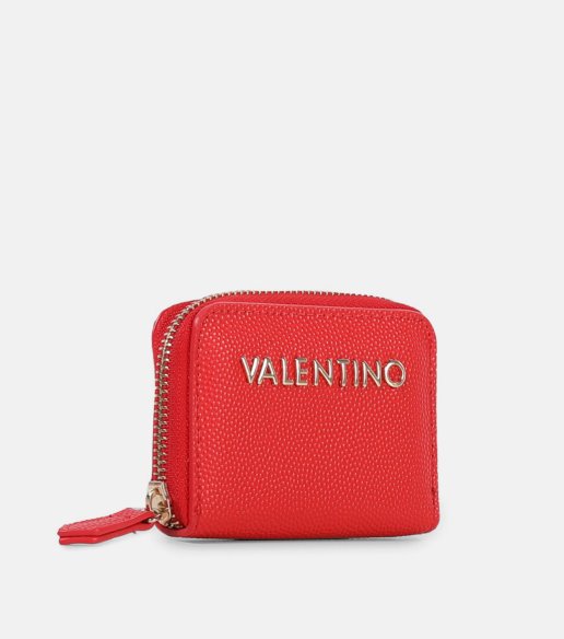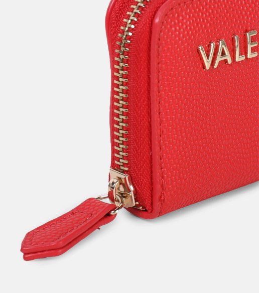 Cartera Valentino en color rojo, de formato pequeño y práctico. Elaborada en efecto piel con acabado texturizado y logotipo metálico frontal. Cierre de cremallera envolvente. Interior organizado con varios compartimentos. Medidas: 7,5 x 10 x 1,8 cm.