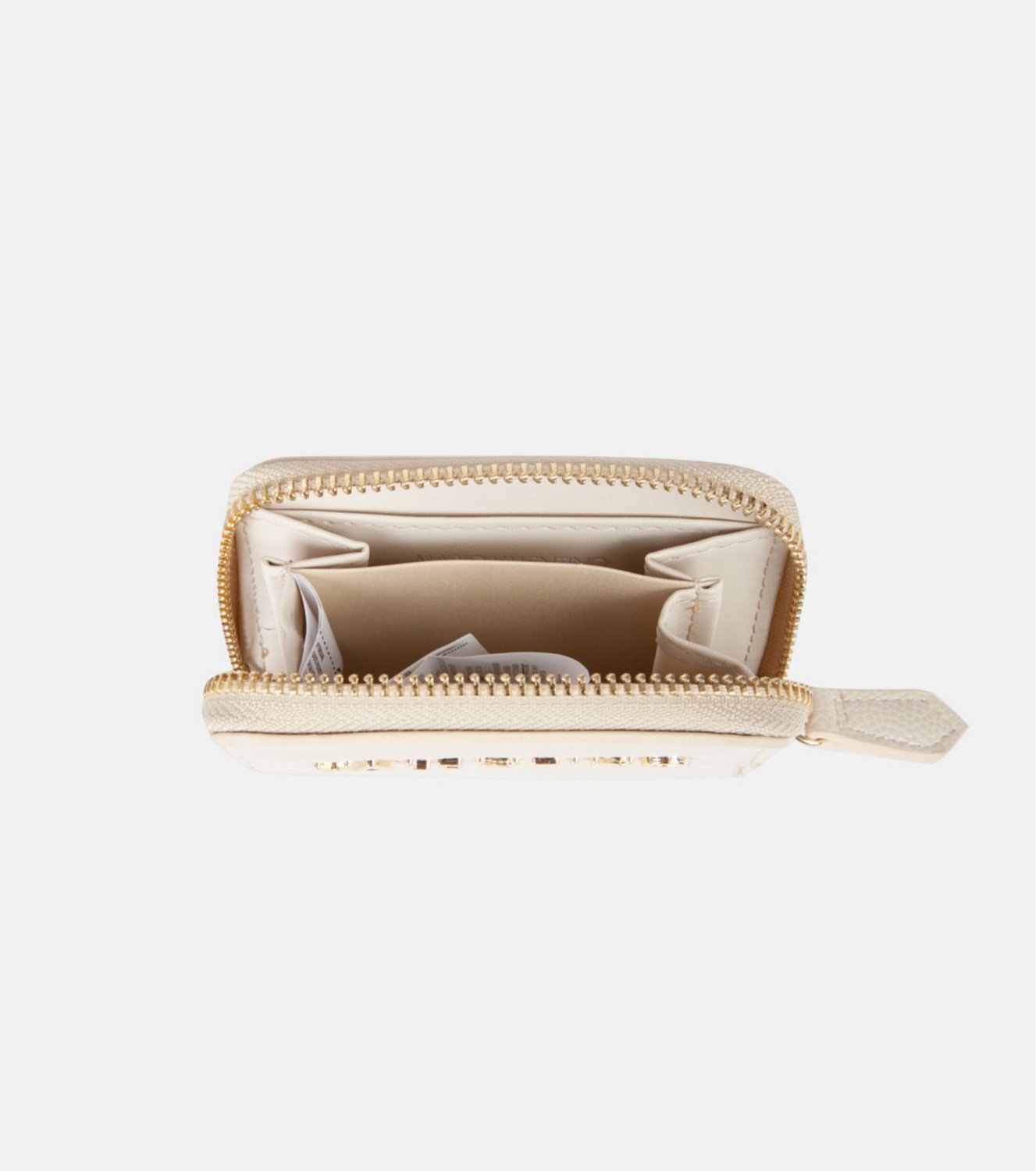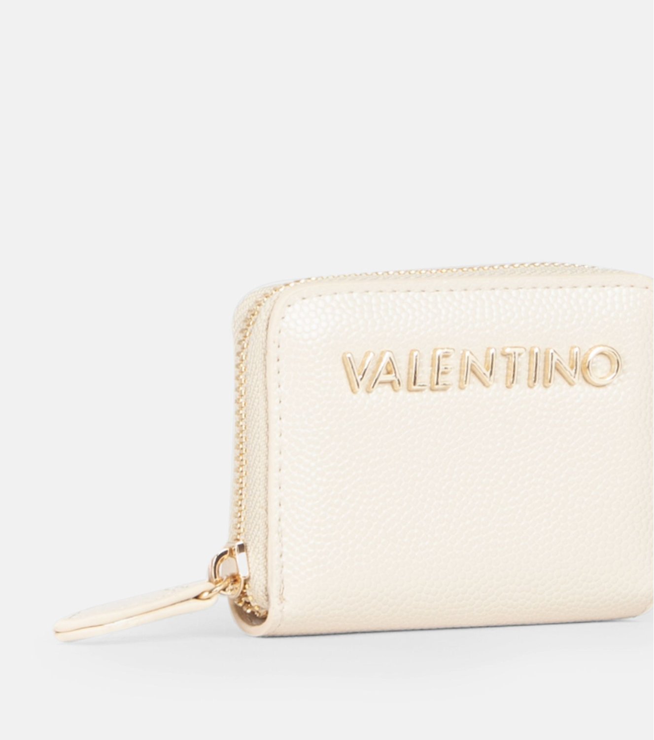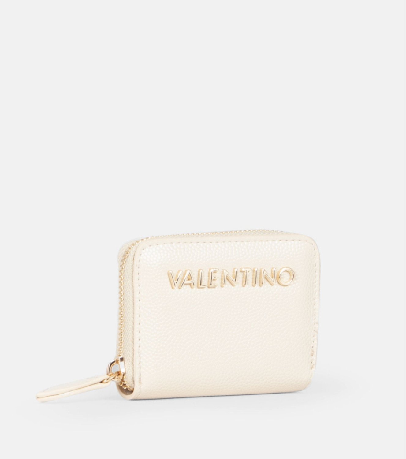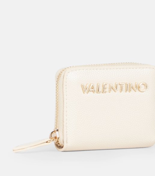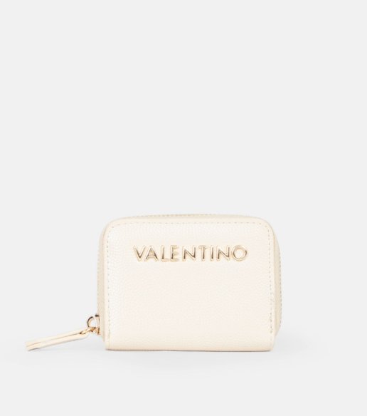 Cartera Valentino en color beige, de tamaño compacto y funcional. Confeccionada en material efecto piel con textura granulada y logo metálico. Cierre de cremallera perimetral. Interior con compartimentos múltiples. Medidas: 7,5 x 10 x 1,8 cm.