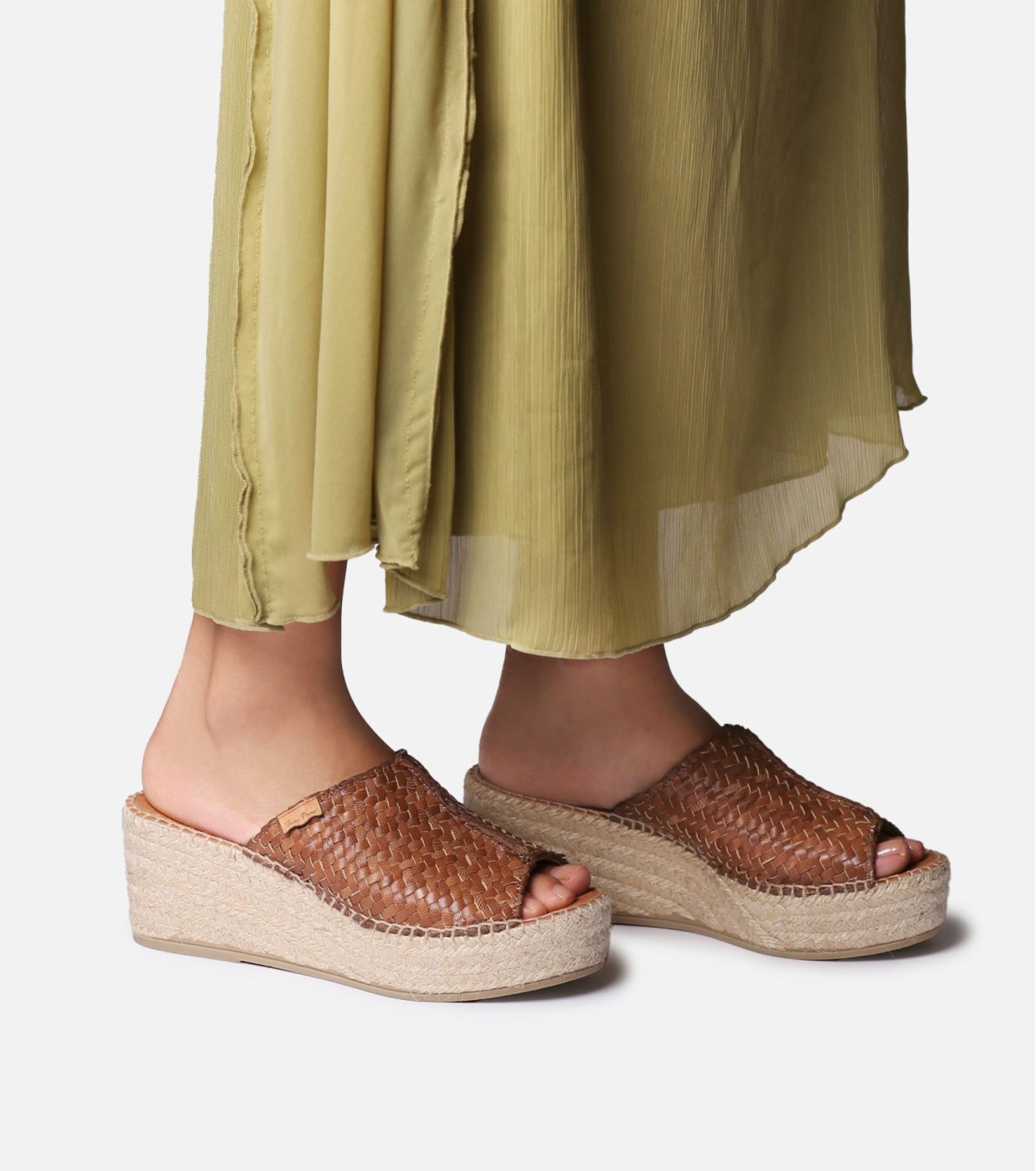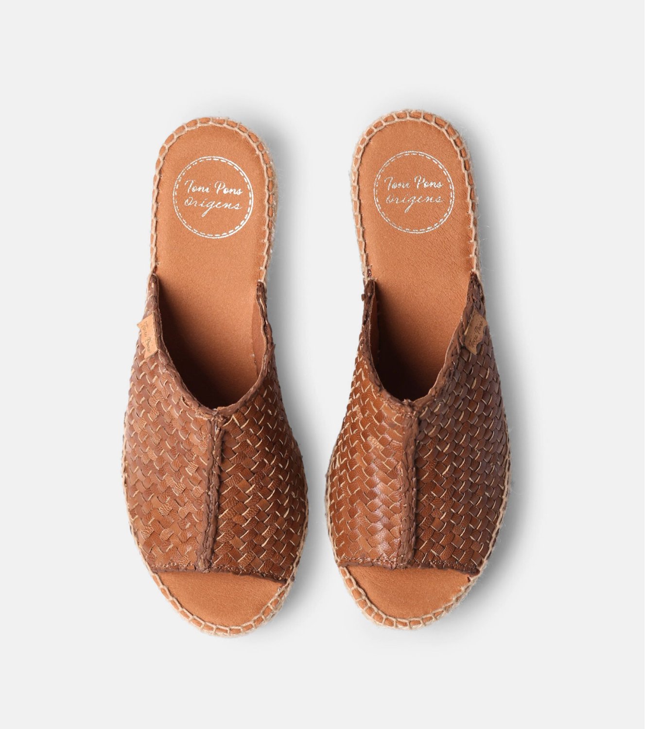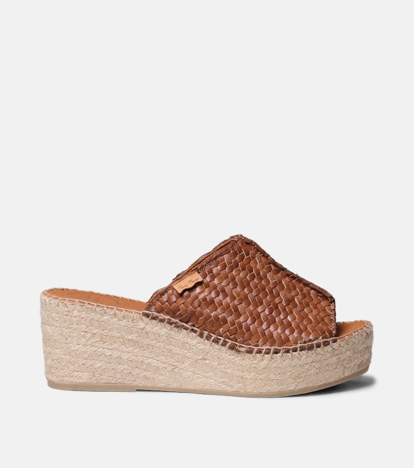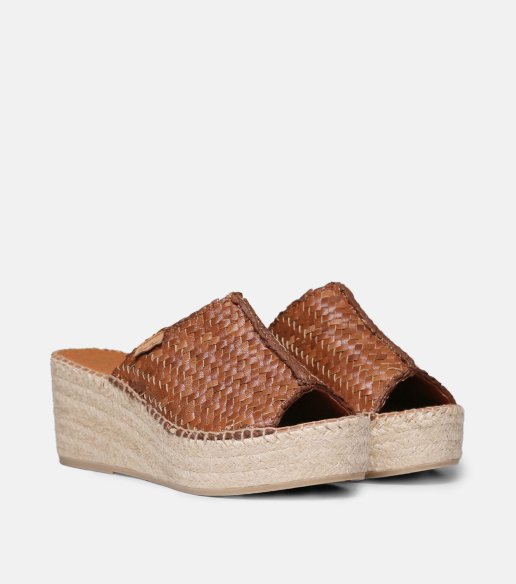 Alpargata de cuña tipo mule ISOLDA de Toni Pons en color cuero. Elaborada en piel trenzada. Pala ancha abierta en la parte delantera. Plataforma y cuña forradas en yute natural. Plantilla acolchada. Cuña total de 7 cm. Fabricada en España.