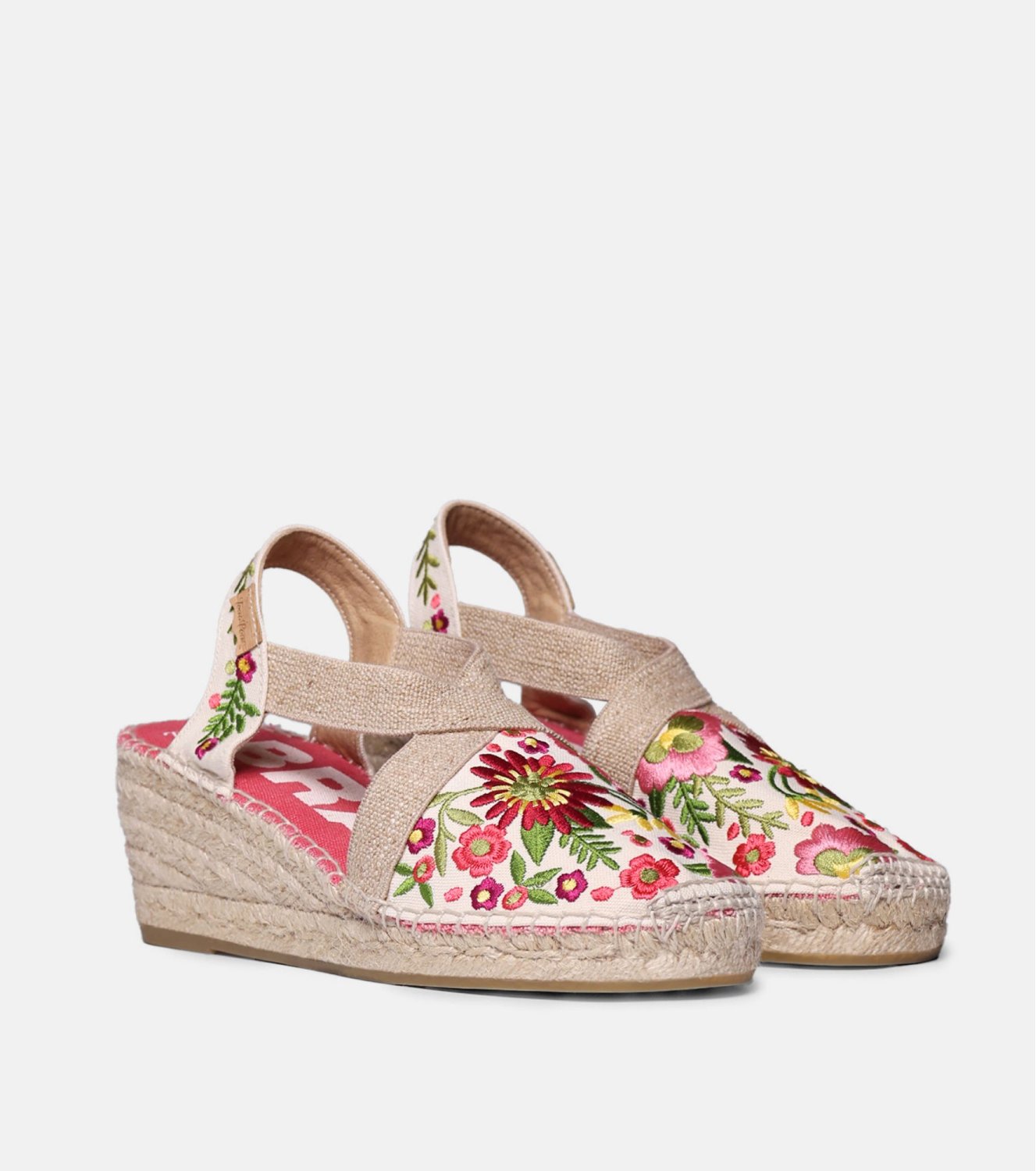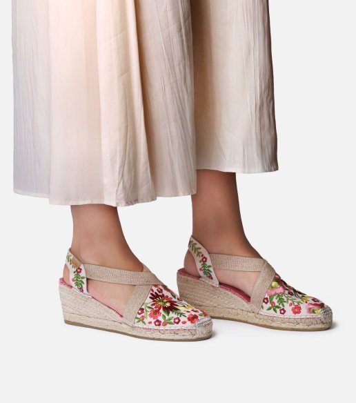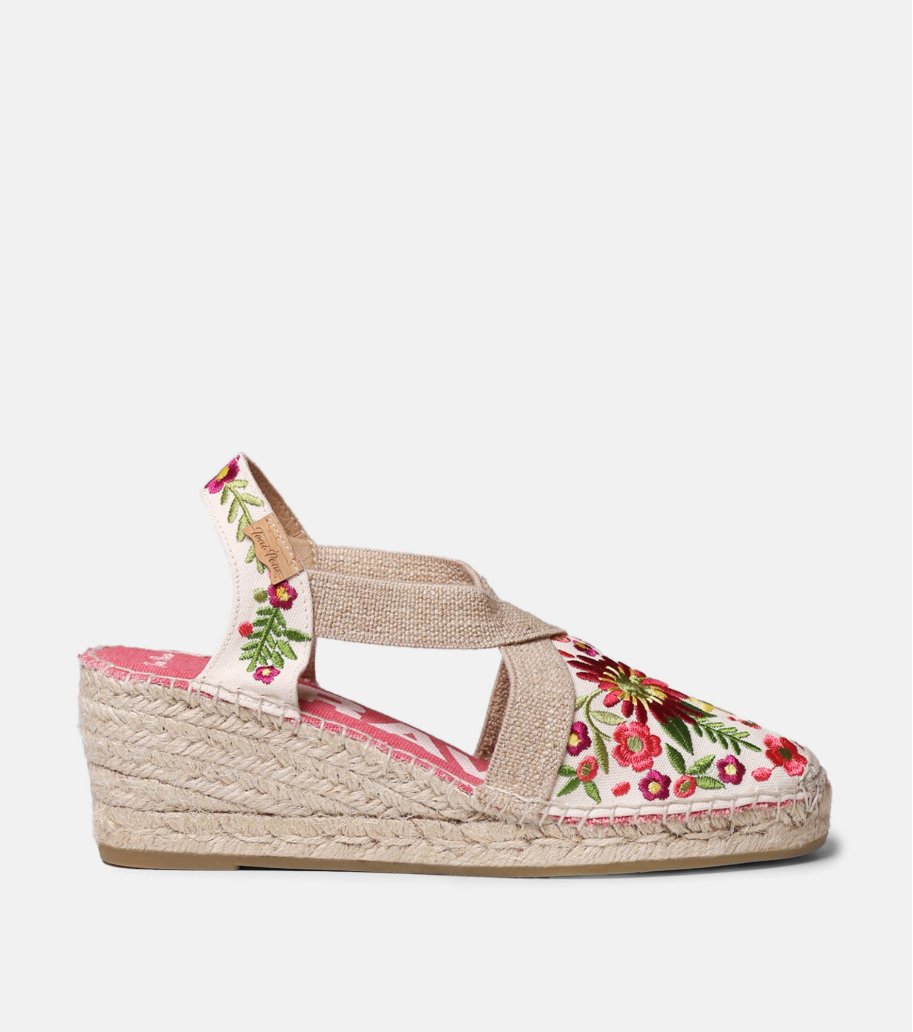Alpargata MONTJOI de Toni Pons multicolor. Elaborada en algodón con bordado floral inspirado en la costa mediterránea. Puntera cerrada y talón abierto con doble banda elástica. Cuña y plataforma forradas en yute de 6 cm. Fabricada en España.