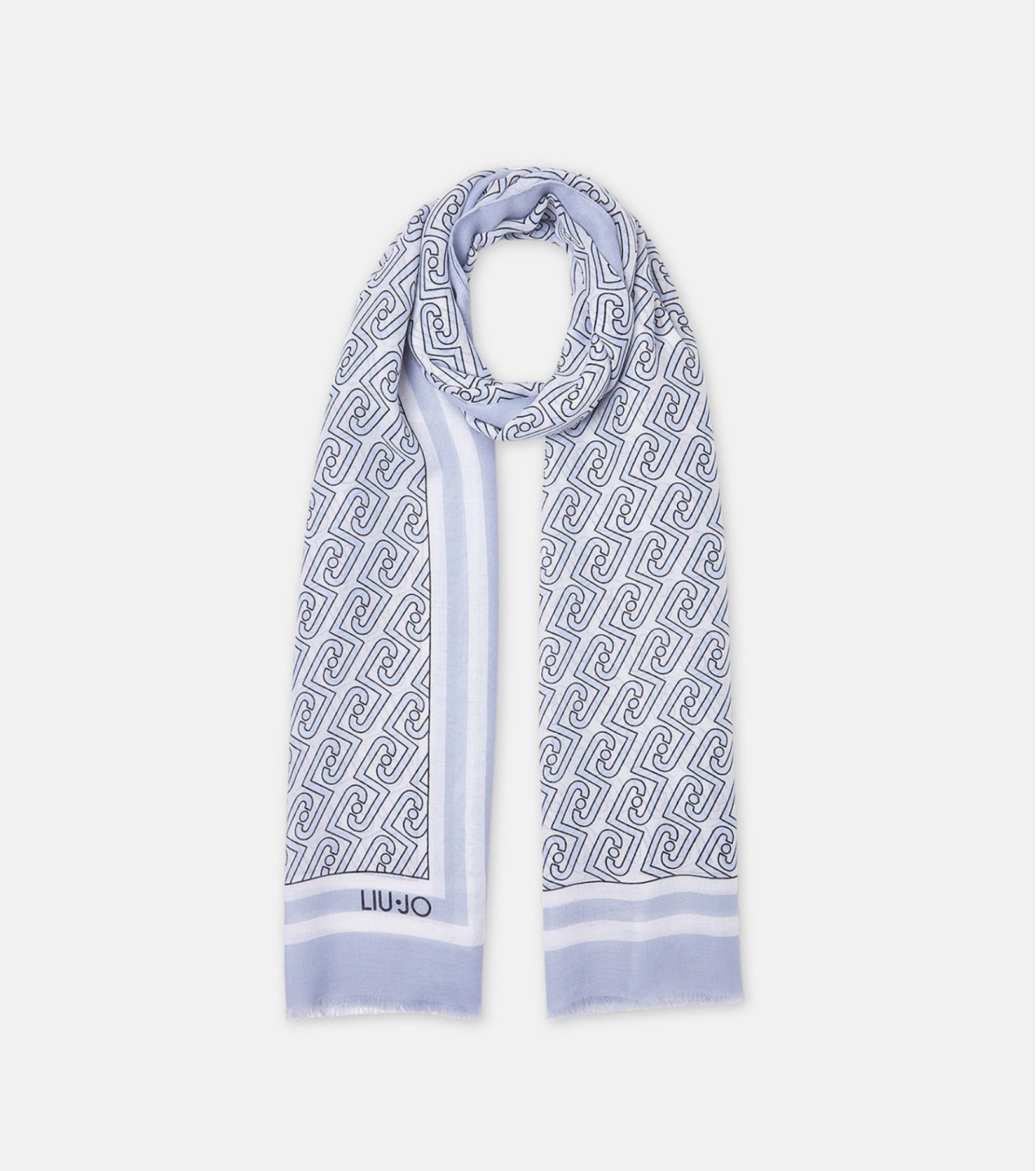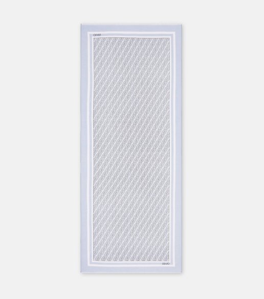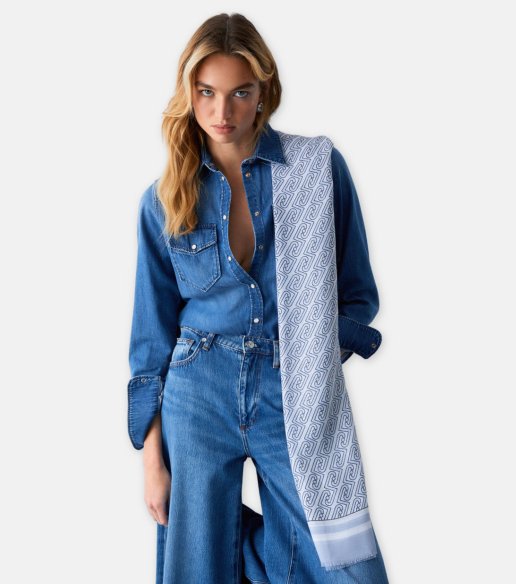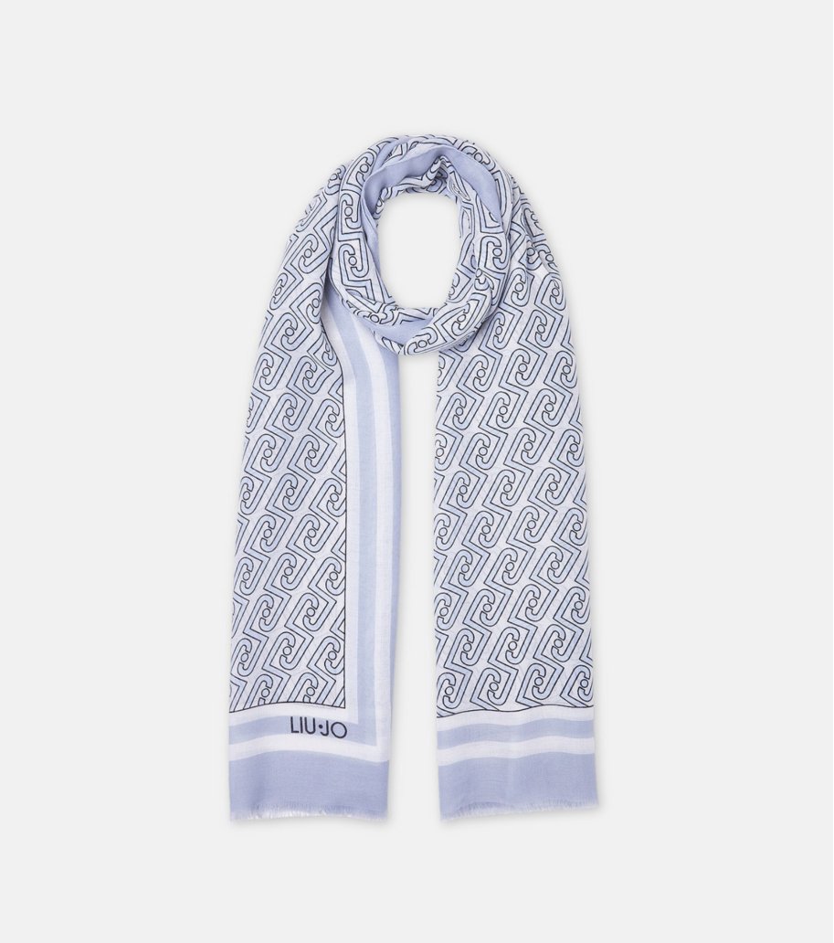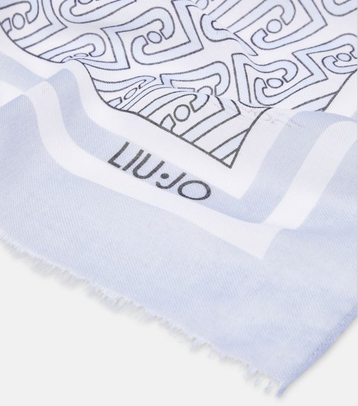 Estola Liu Jo Better en color denim claro. Confeccionada en 100 % poliéster, con tacto suave y ligero. Diseño estampado con logotipo LJ por toda la superficie. Bordes sin rematar para un acabado fluido. Medidas 70 x 180 cm.