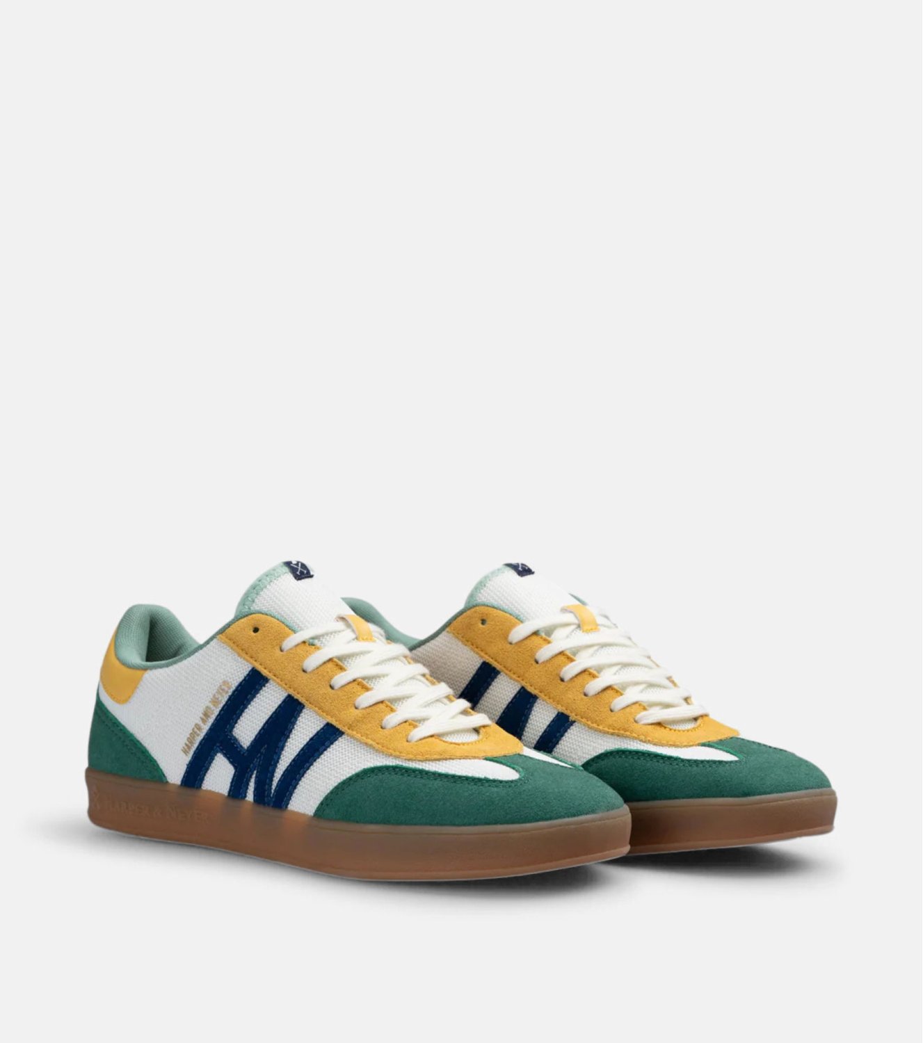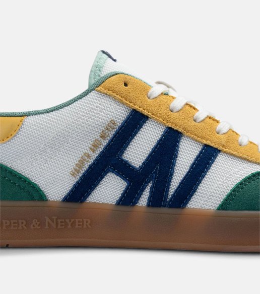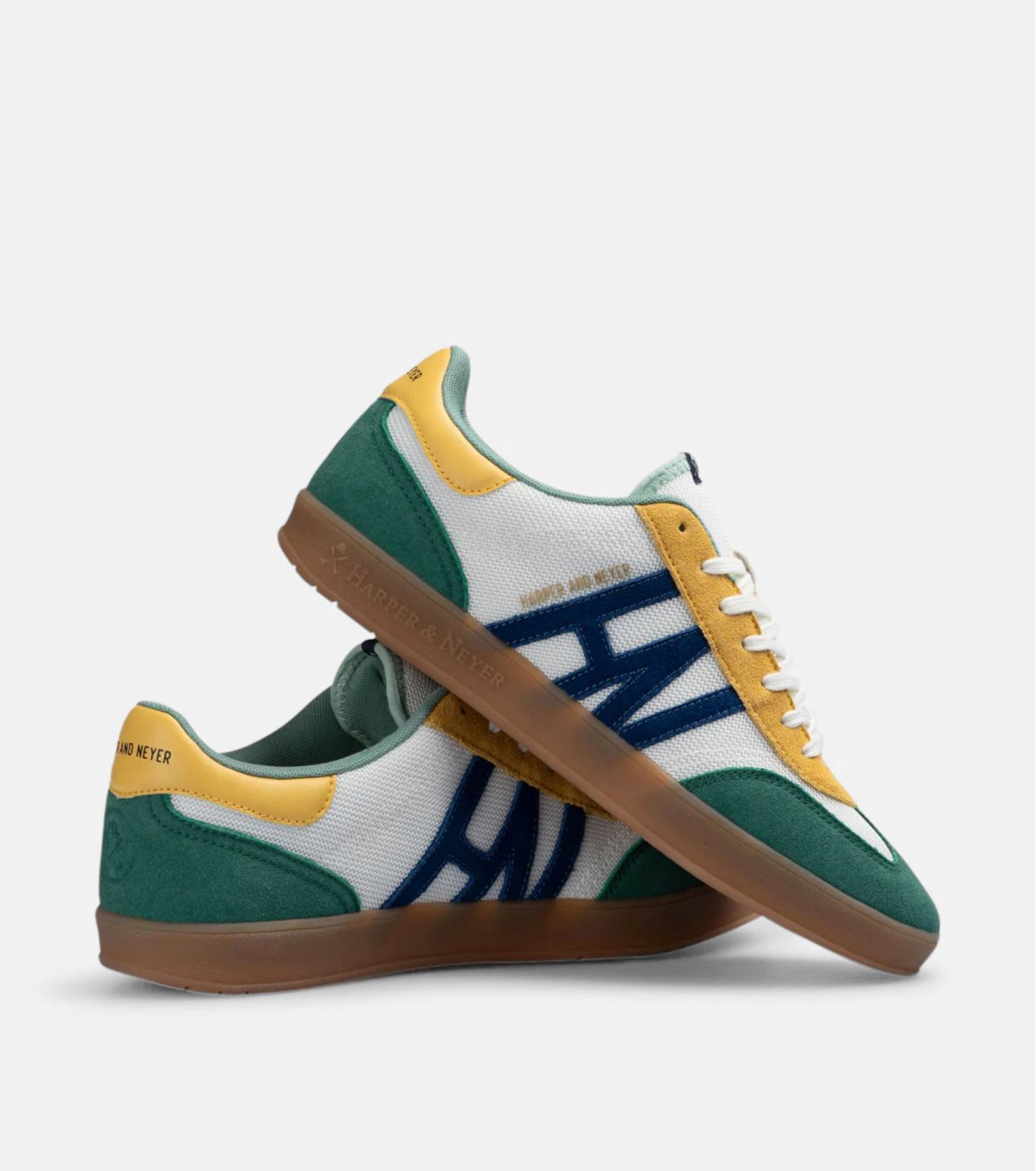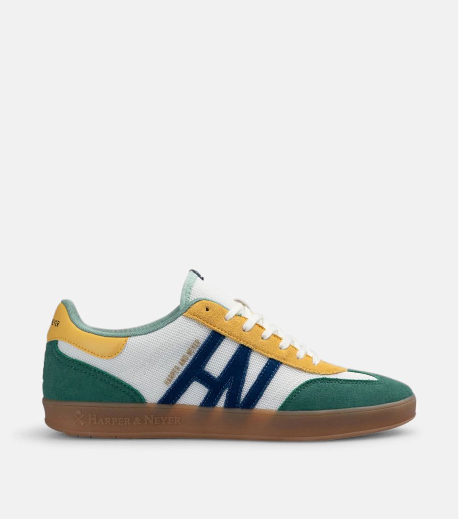 Deportivo Hamptons Lite de Harper & Neyer en combinación verde, blanco y mostaza. Fabricadas en textil y piezas en piel combinada. Suela de goma y cierre de cordones. Diseño ligero y cómodo para el día a día, ideal para un estilo casual actual.