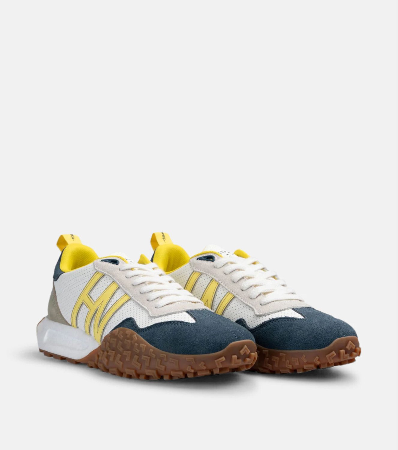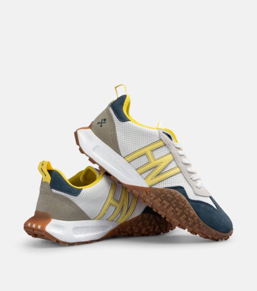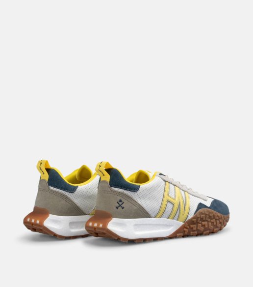 Deportivo Carcross Point de Harper & Neyer en combinación blanco, azul y amarillo. Fabricadas en combinación de paneles textiles y detalles en ante. Suela de goma dentada y cierre de cordones. Diseño deportivo y versátil para un look casual.