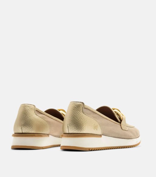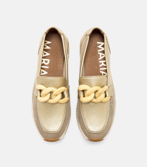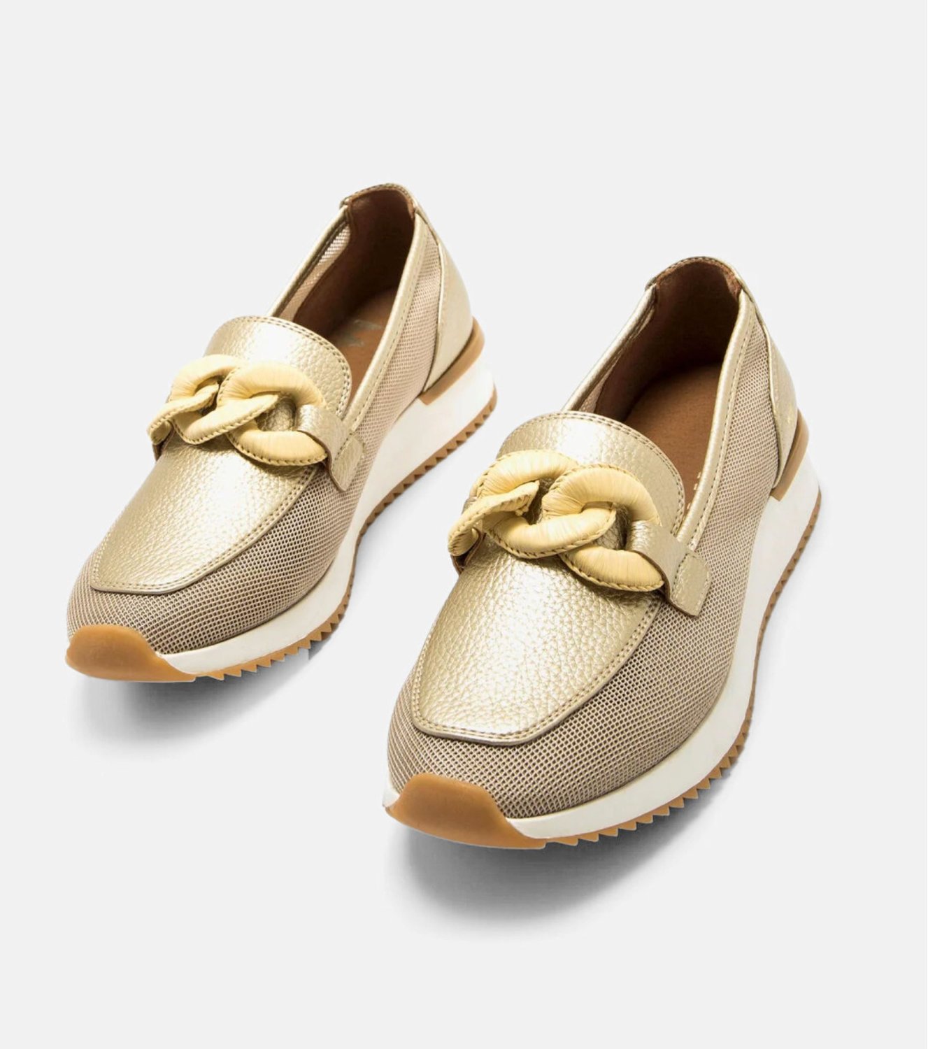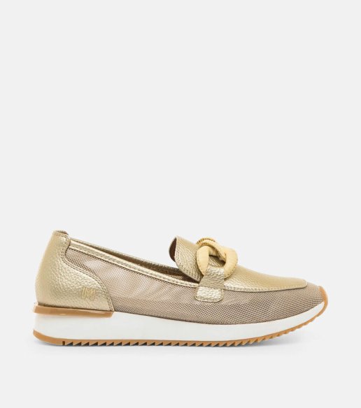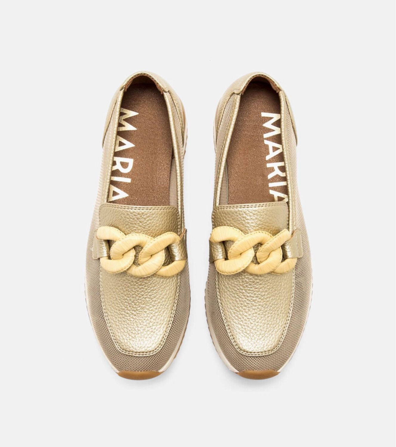 Mocasín Livana de Mariamare en color oro. Diseño casual con acabado metalizado y detalle de eslabón decorativo en la pala. Combina textura granulada con paneles de malla lateral que aportan ligereza. Suela dentada y plantilla confortable.