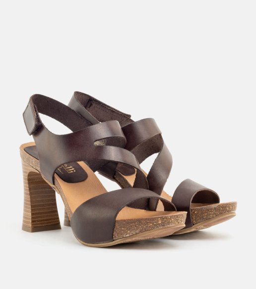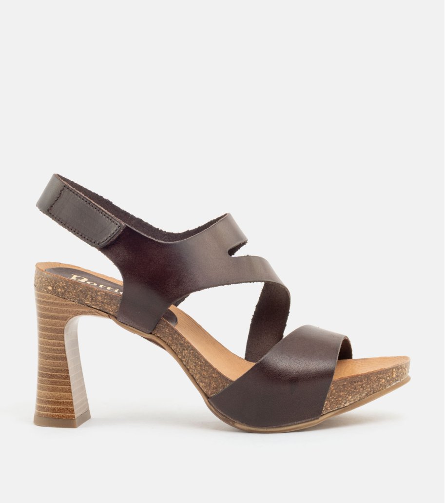 Sandalia Botticelli en color marrón. Elaborada en piel. Diseño de tiras anchas que envuelven el empeine y aportan mayor sujeción. Cierre con velcro ajustable. Planta con base tipo corcho, plataforma delantera y tacón alto efecto madera de 9 cm.