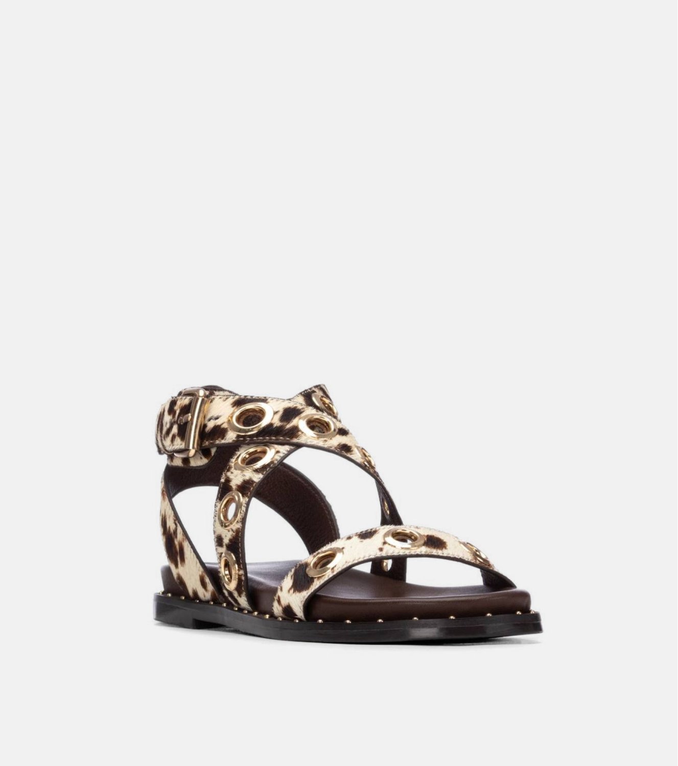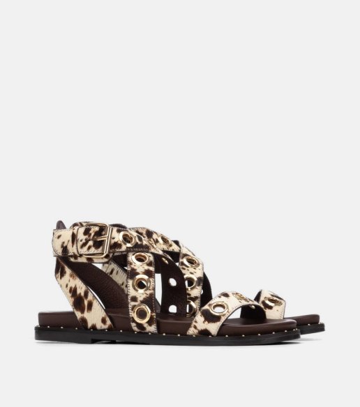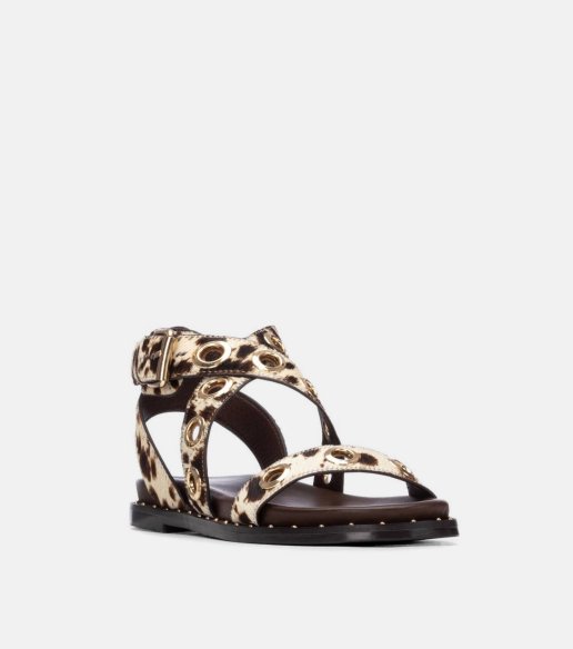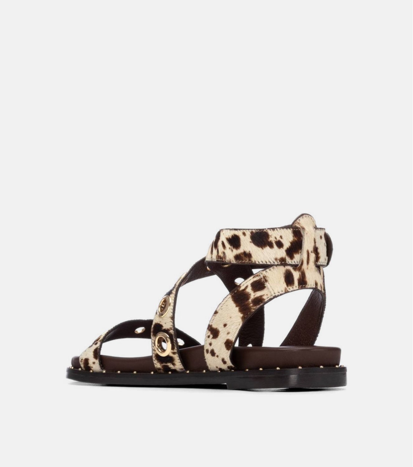 Sandalia Carmela con estampado de vaca en tendencia. Confeccionada en piel. Incorpora cierre de pulsera ajustable y una suela de goma en tono oscuro, con detalle de tachas doradas. Pensado para dar protagonismo a tus looks de verano.