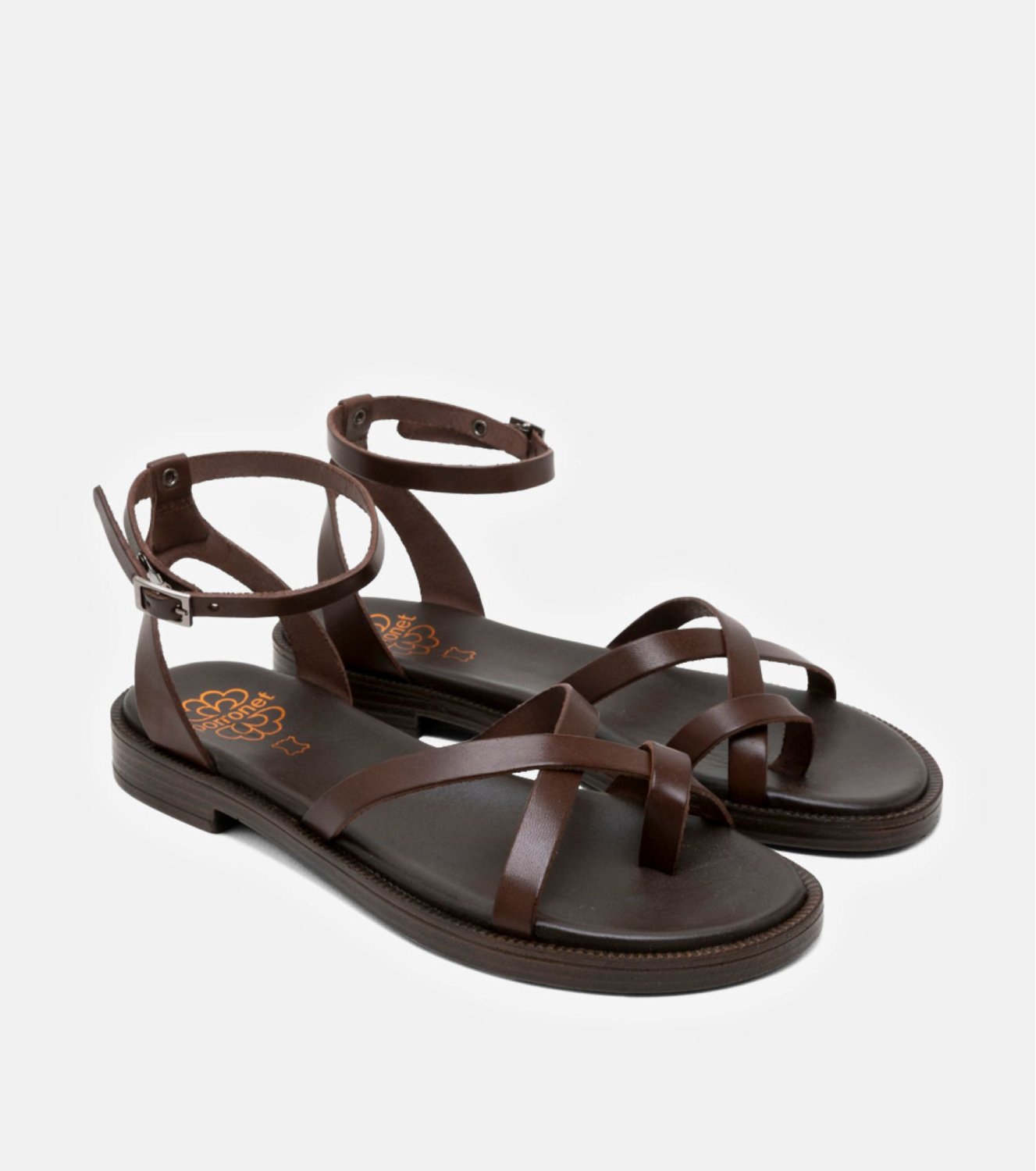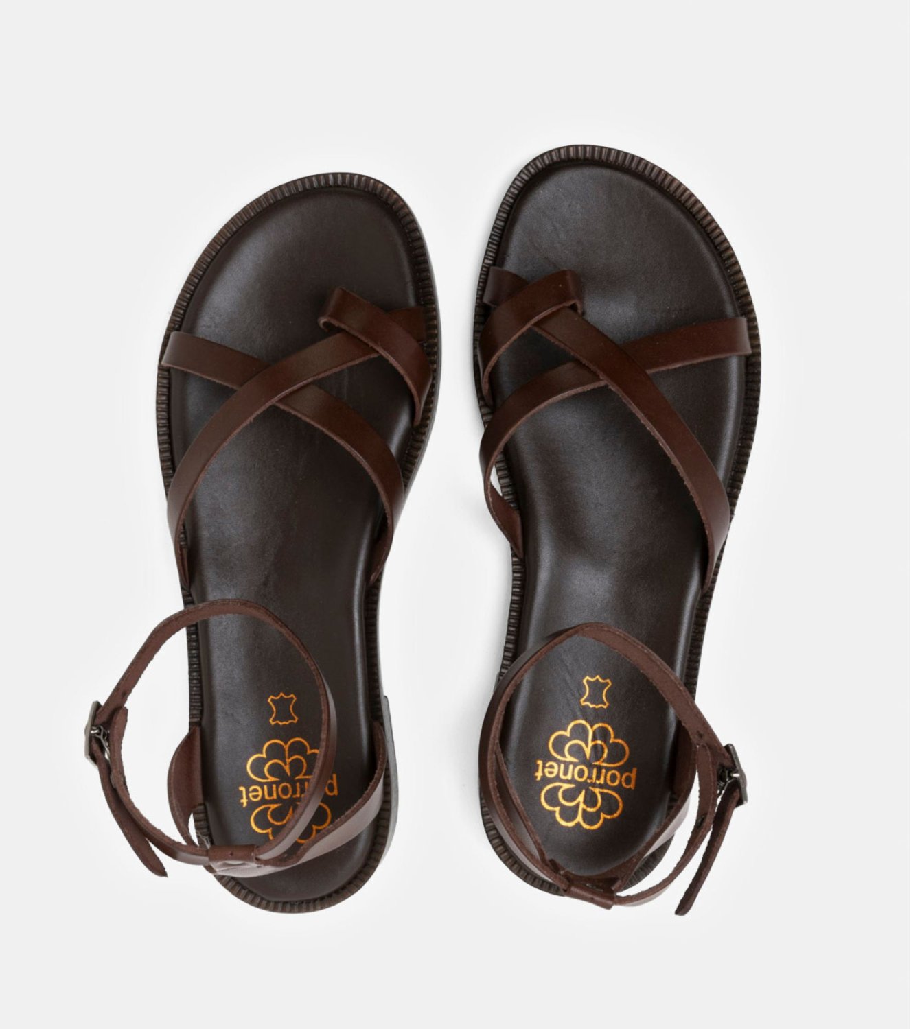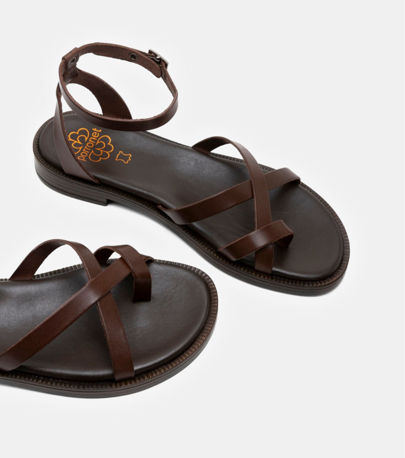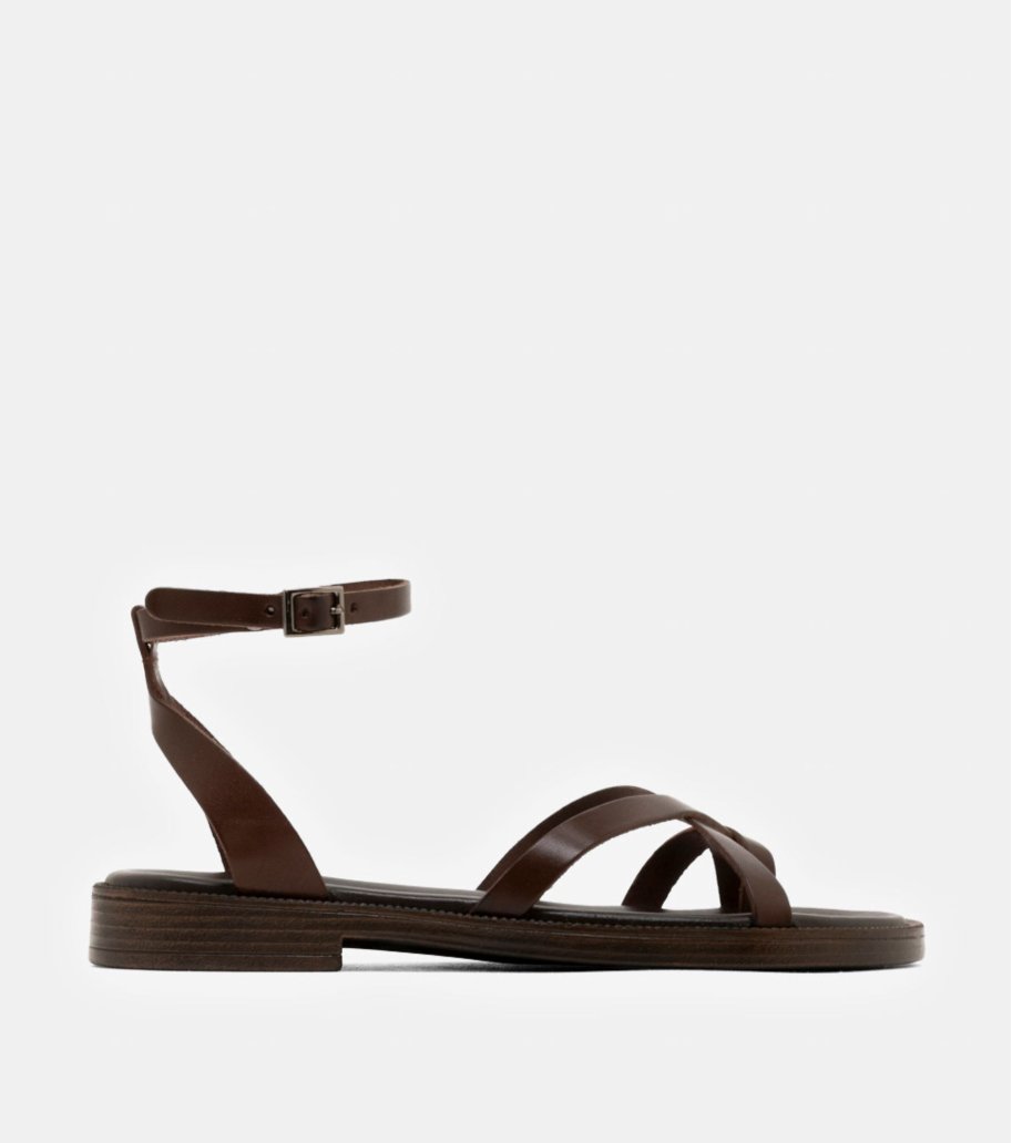 Sandalia Porronet en color marrón. Elaborada en piel y fabricada en España. Modelo con tira central tipo esclava y cruce delicado en la pala. Ajuste mediante pulsera al tobillo con hebilla lateral. Plantilla acolchada y suela plana flexible y ligera.
