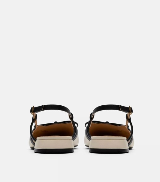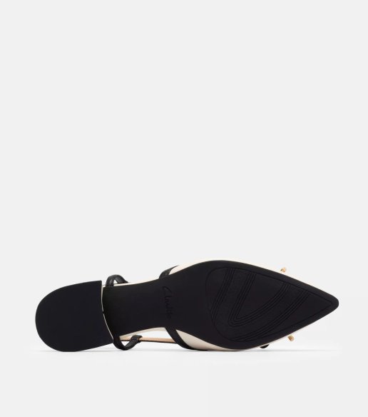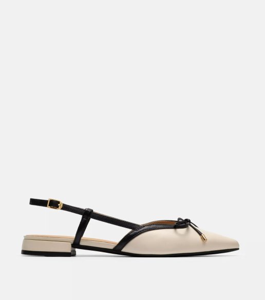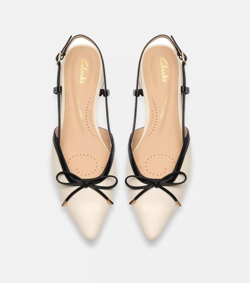 Bailarina destalonada Clarks en color crema. Fabricado en piel con acabado liso y detalle de lazo en la puntera. Diseño slingback con hebilla ajustable y tacón bajo de 1,5 cm. Suela flexible que aporta estabilidad y confort para el uso diario.