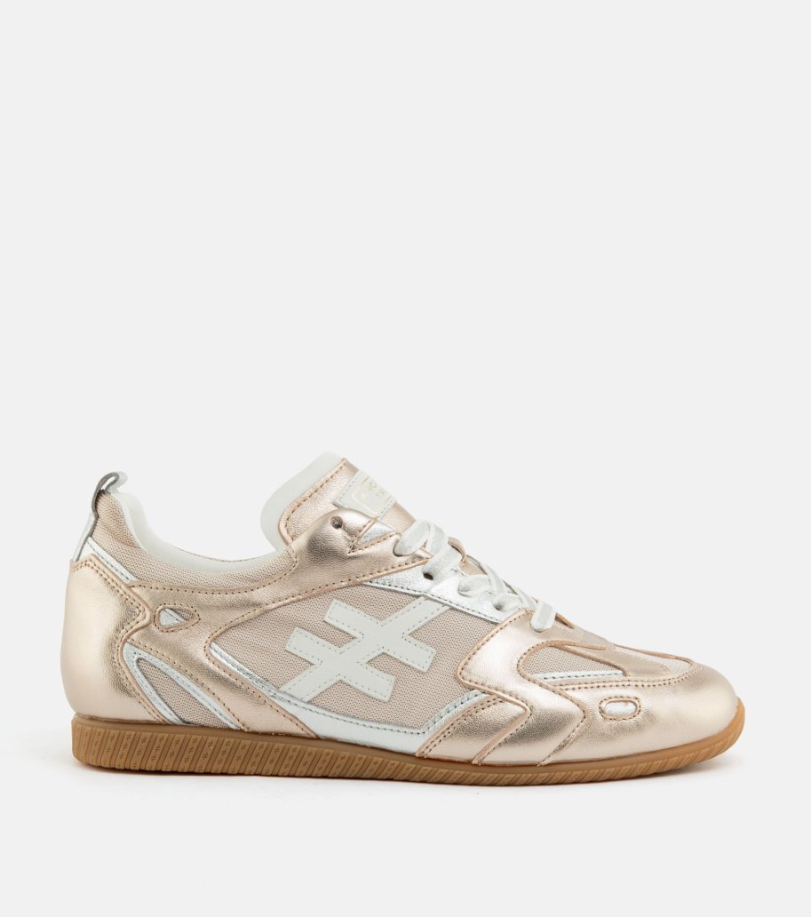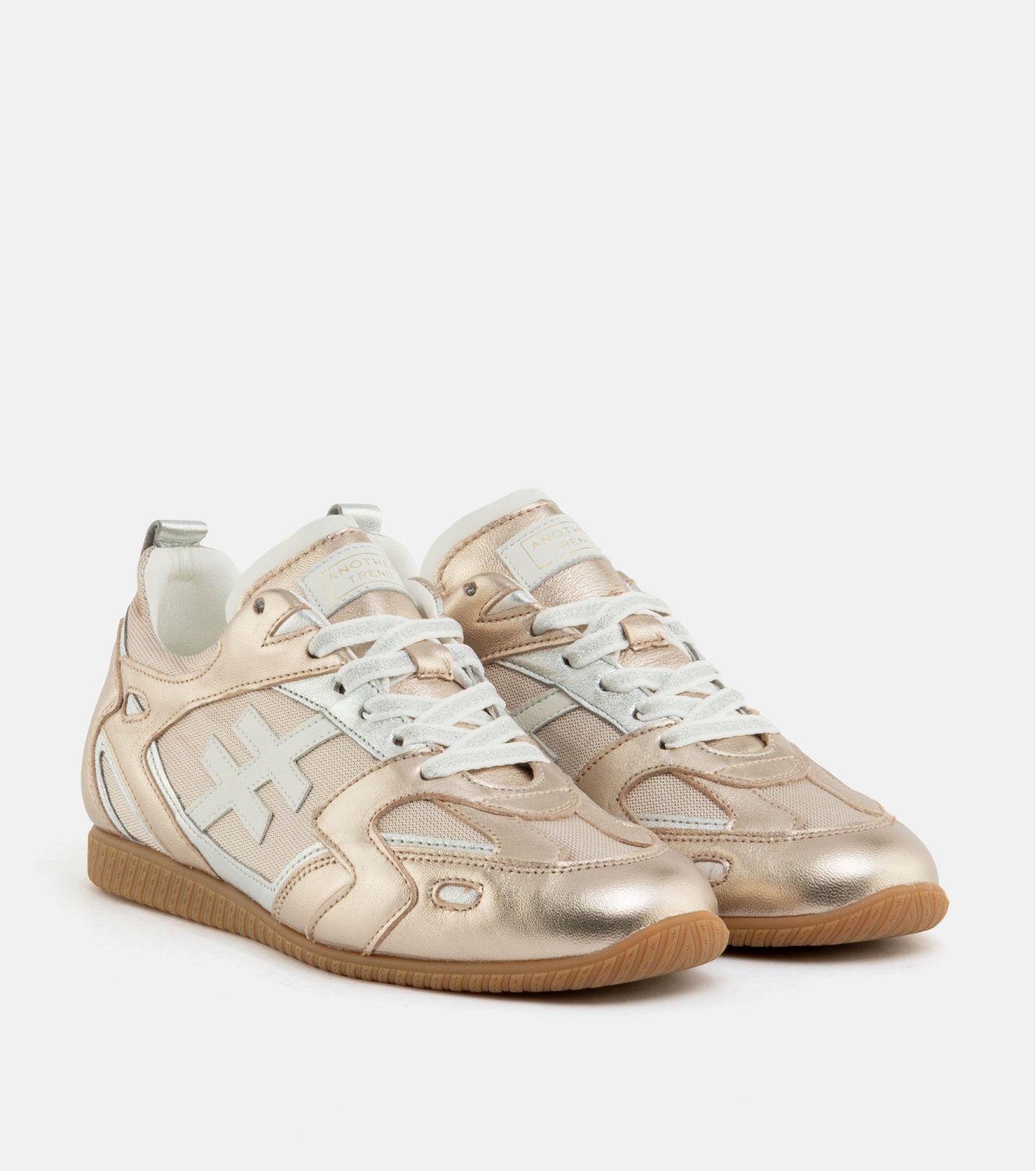 Deportiva de mujer Another Trend en color cobre. Fabricada en piel combinada con detalles metalizados. Cierre de cordones y piezas superpuestas en el lateral. Suela de goma en tono caramelo que aporta buen agarre y comodidad.