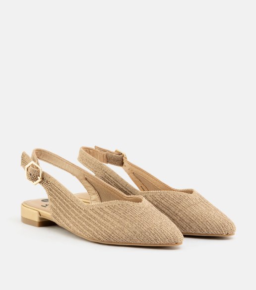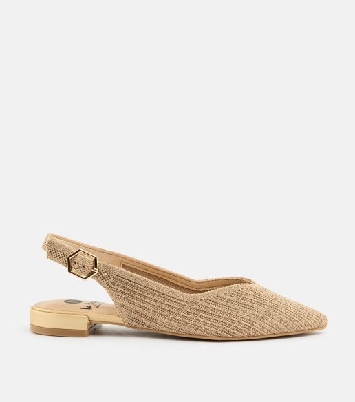 Bailarina destalonada La Strada en color oro. Diseño ligero con acabado en tejido y puntera estilizada. Incorpora tira trasera con hebilla metálica ajustable para mejor sujeción. Tacón bajo que aporta comodidad, ideal para looks de primavera.
