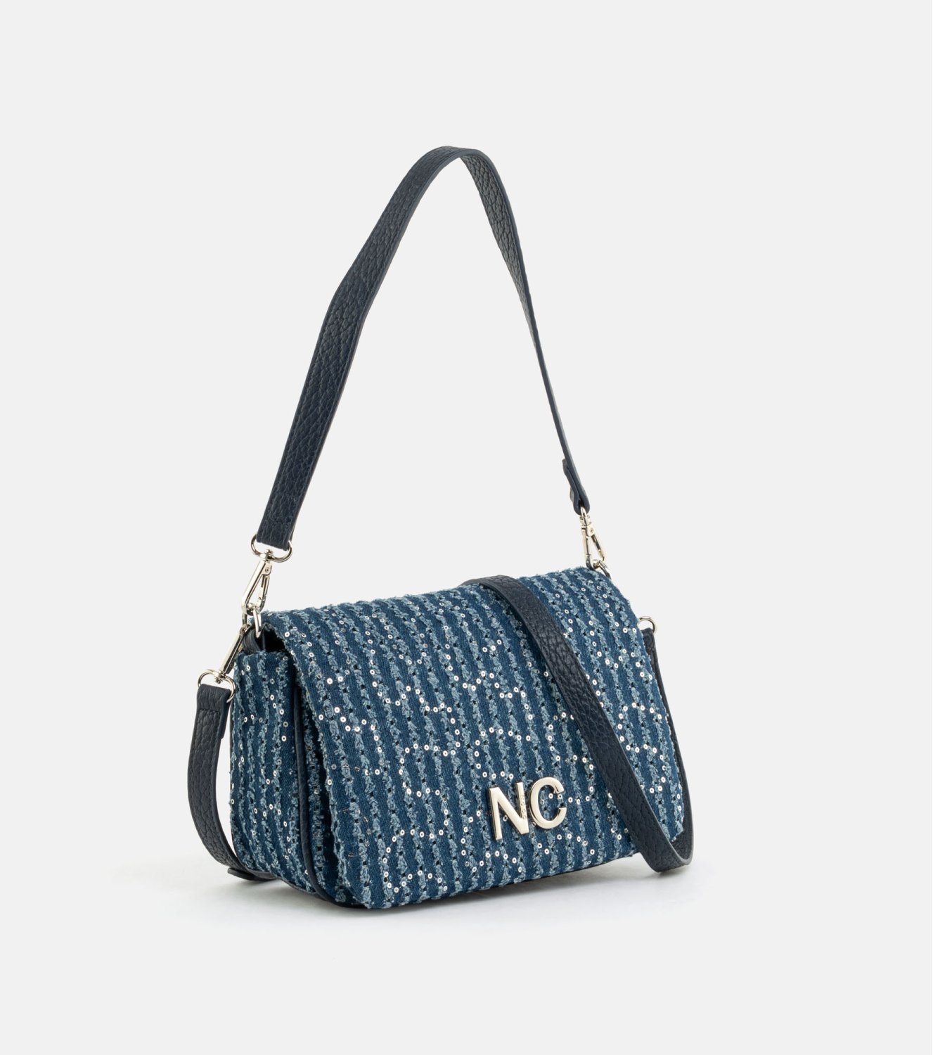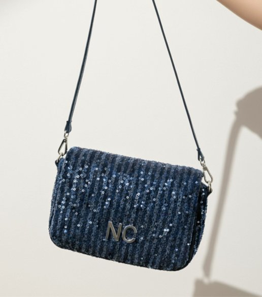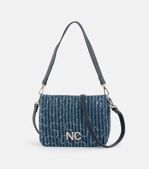 Bandolera Noco en azul denim. Confeccionada en tejido vaquero con incrustaciones de lentejuelas cosidas. Cierre superior con cremallera, logo metálico NC en el frontal y correa larga ajustable para llevar al hombro o cruzada. Medidas 26 x 14 x 9 cm.