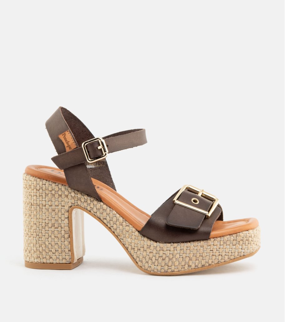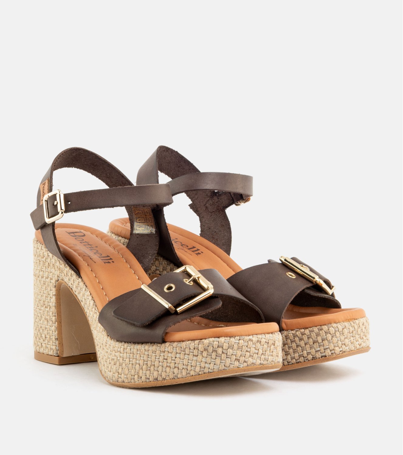 Sandalia Botticelli en color marrón. Confeccionada en piel con pala ancha y detalle de hebilla decorativa. Cierre ajustable en el tobillo para mayor sujeción. Plataforma forrada en rafia y tacón ancho de aprox. 8 cm que aporta altura y estabilidad.