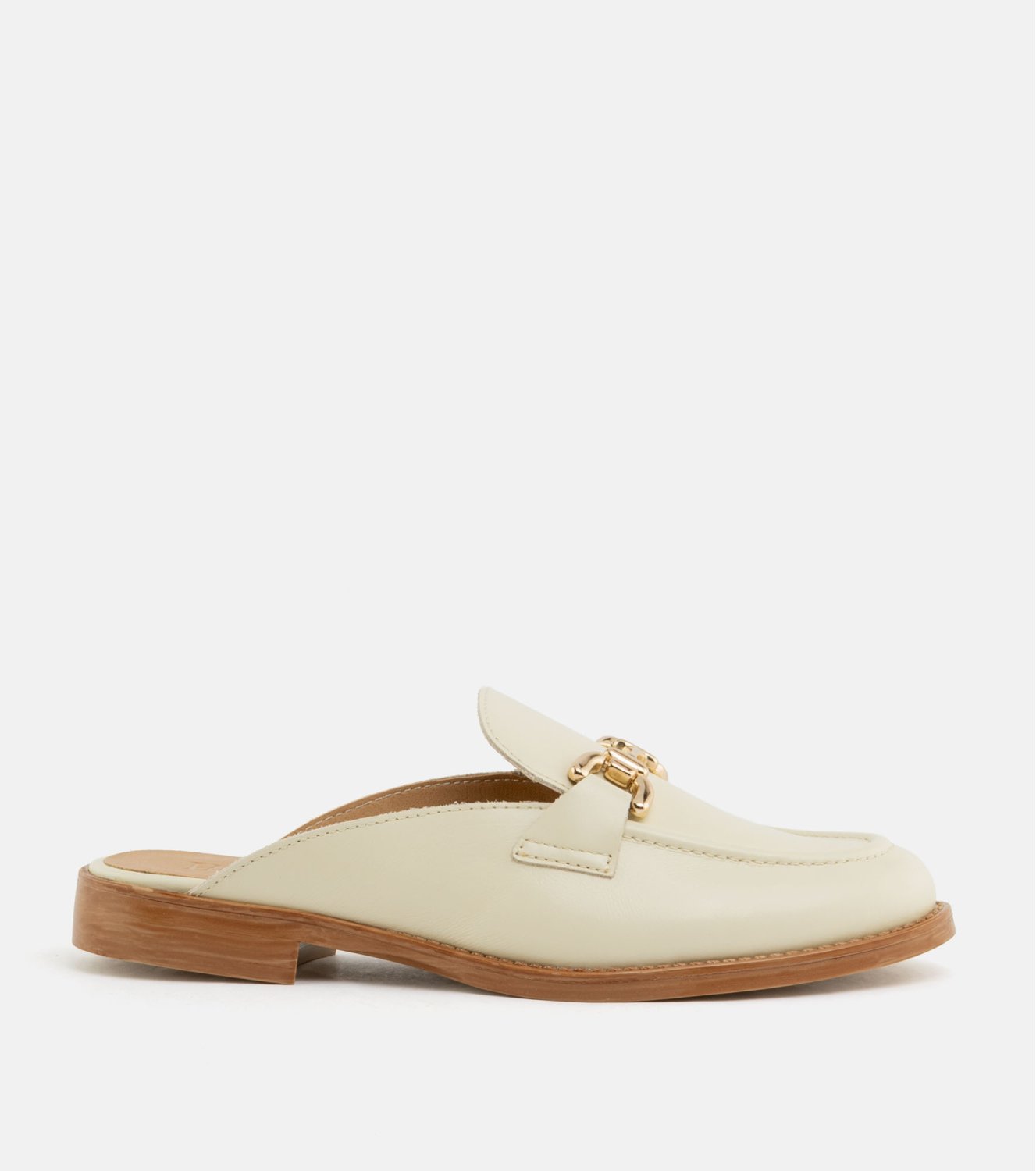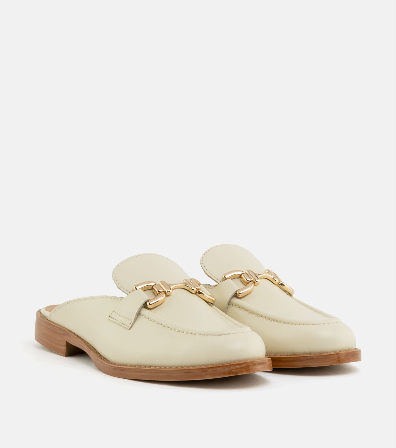 Zueco tipo mule de Botticelli en color beige. Confeccionado en piel con pala cerrada. Detalle de adorno metálico en el empeine. Tacón bajo de aproximadamente 2 cm de altura que le proporciona comodidad.