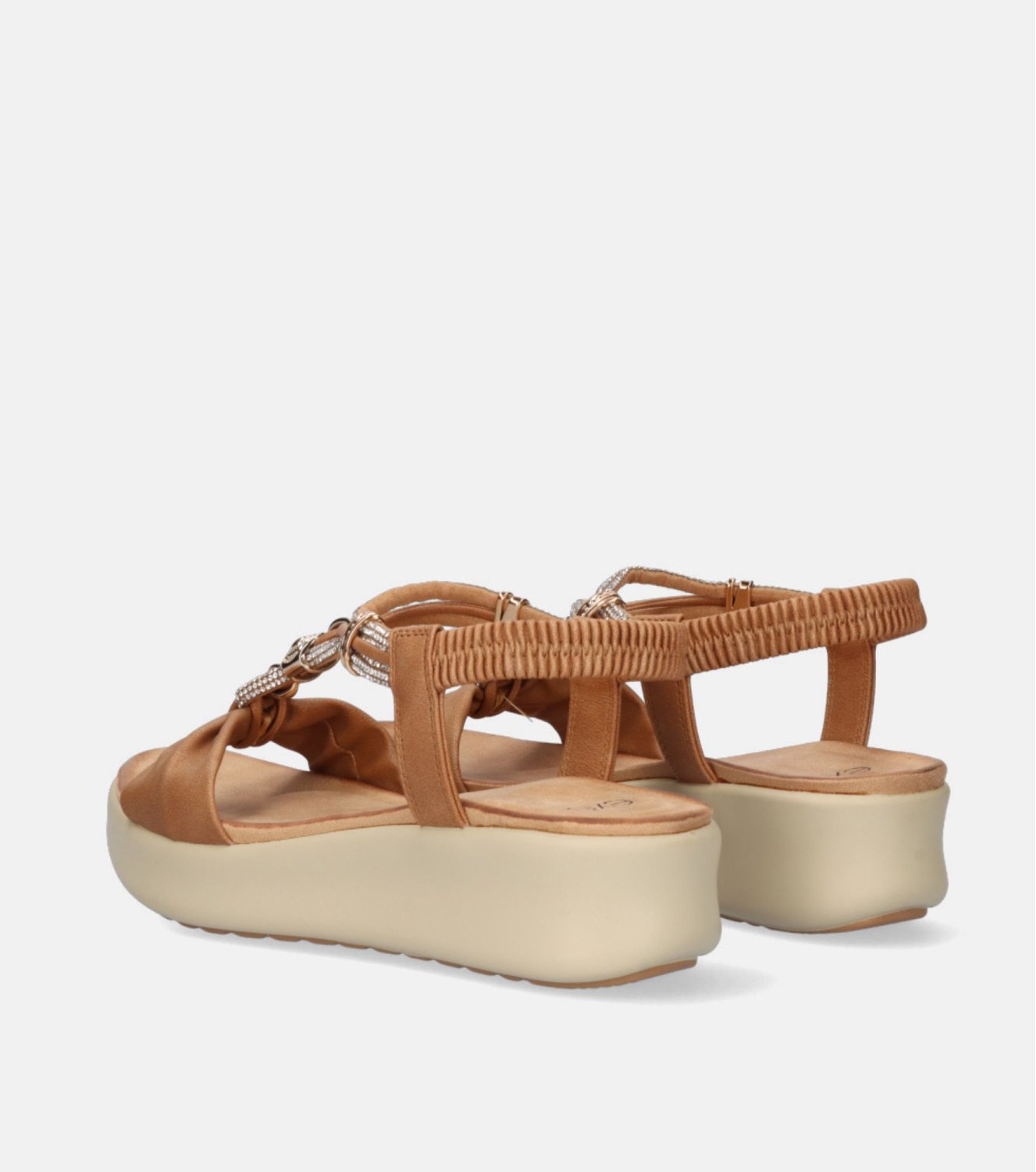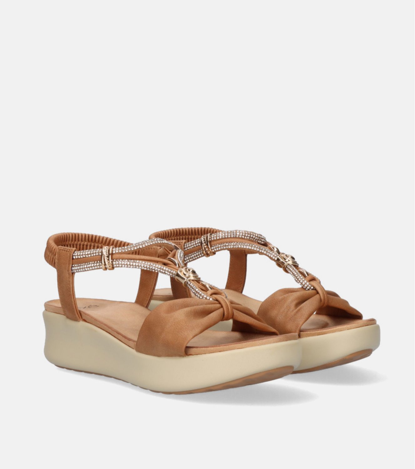 Sandalia Exé en color camel. Confeccionada en material sintético con pala fruncida y tiras decoradas con pedrería y detalles metálicos. Tira trasera elástica. Plataforma ligera de aproximadamente 4 cm.