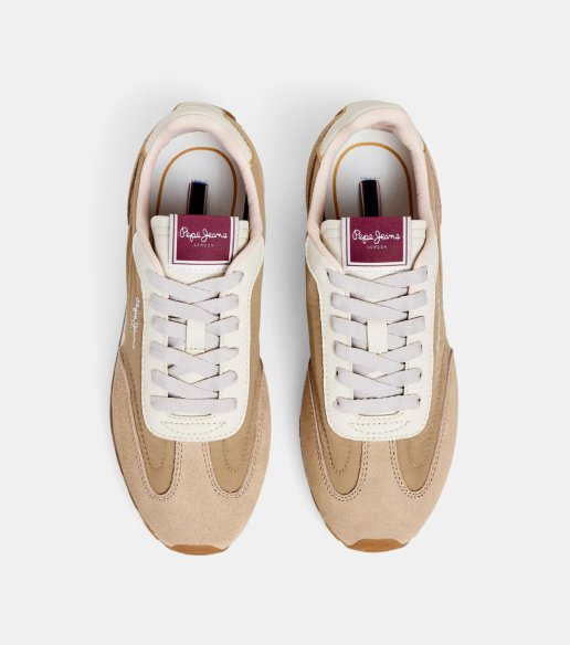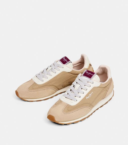 Zapatilla Pepe Jeans Jane en color beige. Confeccionada en combinación de materiales con acabado en ante en puntera y talón. Cierre mediante cordones. Suela de goma con entresuela ligera que aporta comodidad en la pisada. Plantilla extraíble.