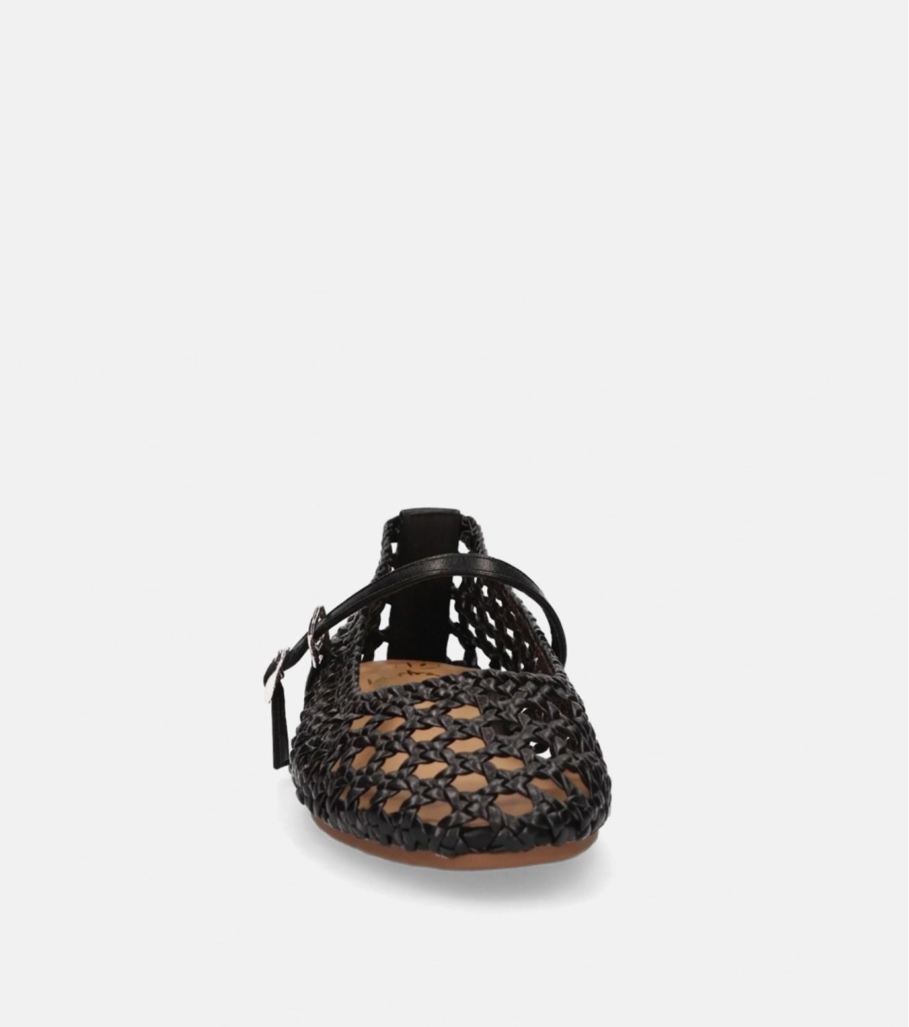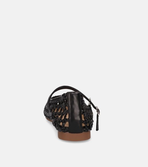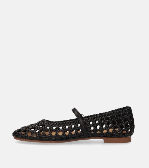 Mercedita La Strada en color negro. Fabricada en material textil con diseño calado tipo rejilla que aporta ligereza. Cierre con hebilla en el empeine para mejor ajuste. Suela plana flexible. Ideal para looks de verano cómodos y transpirable.