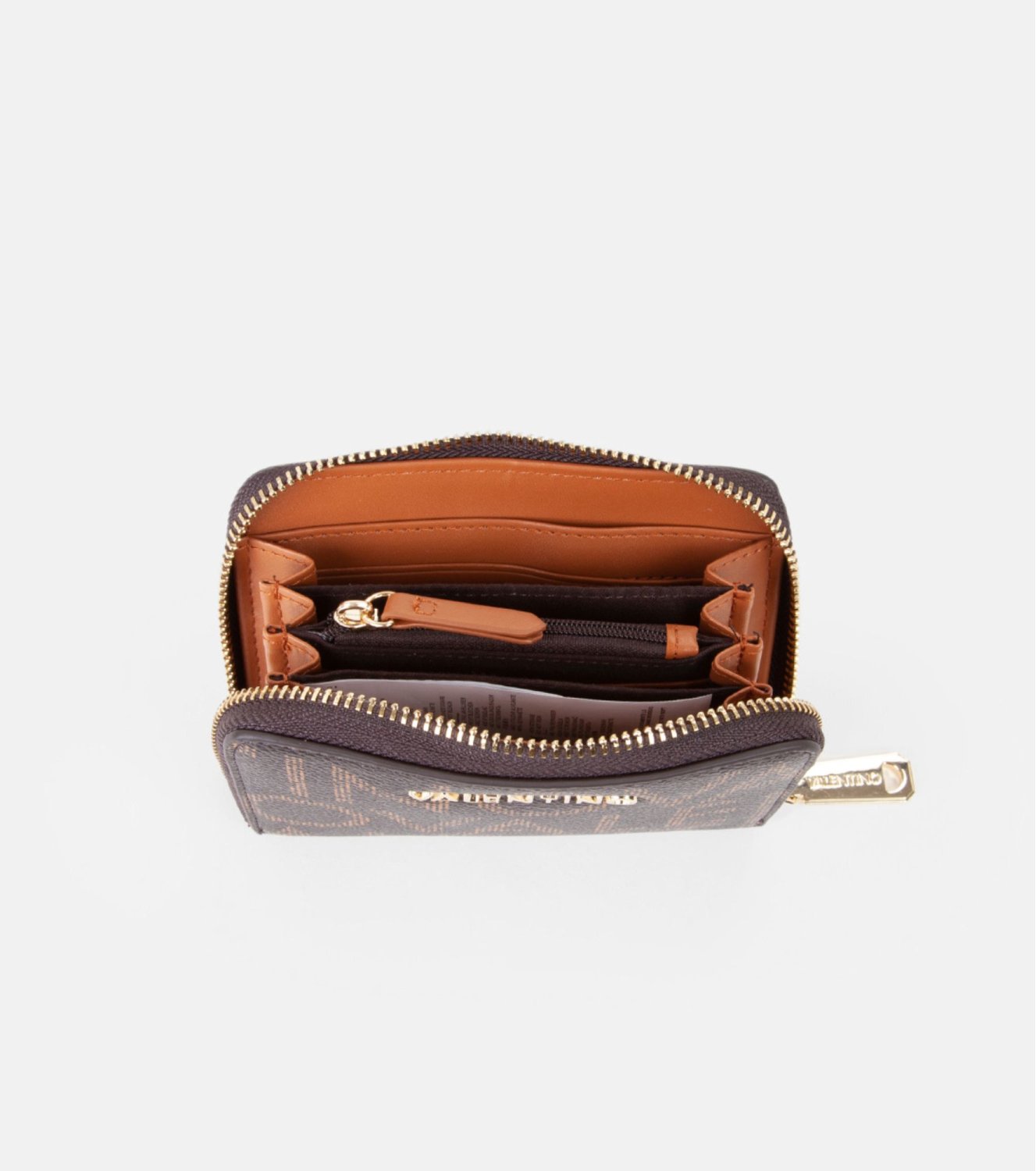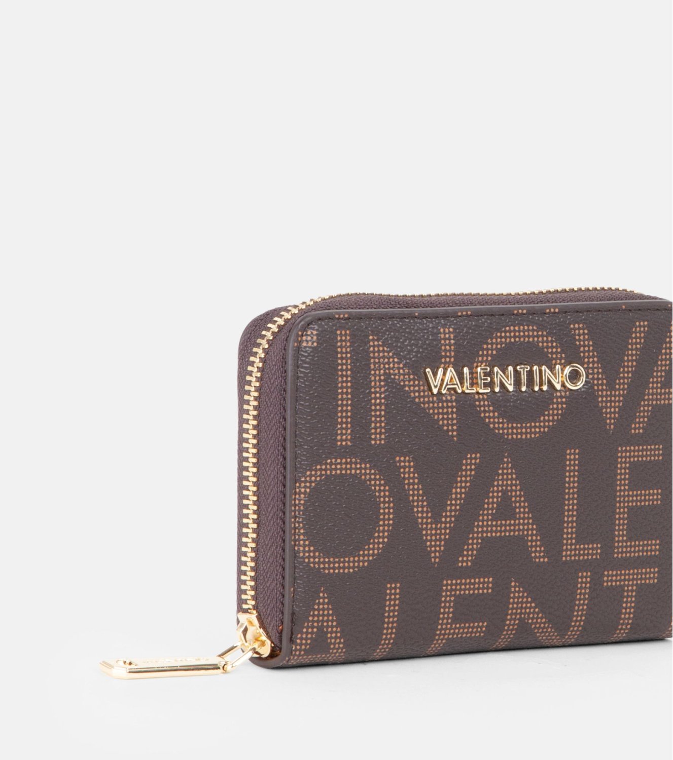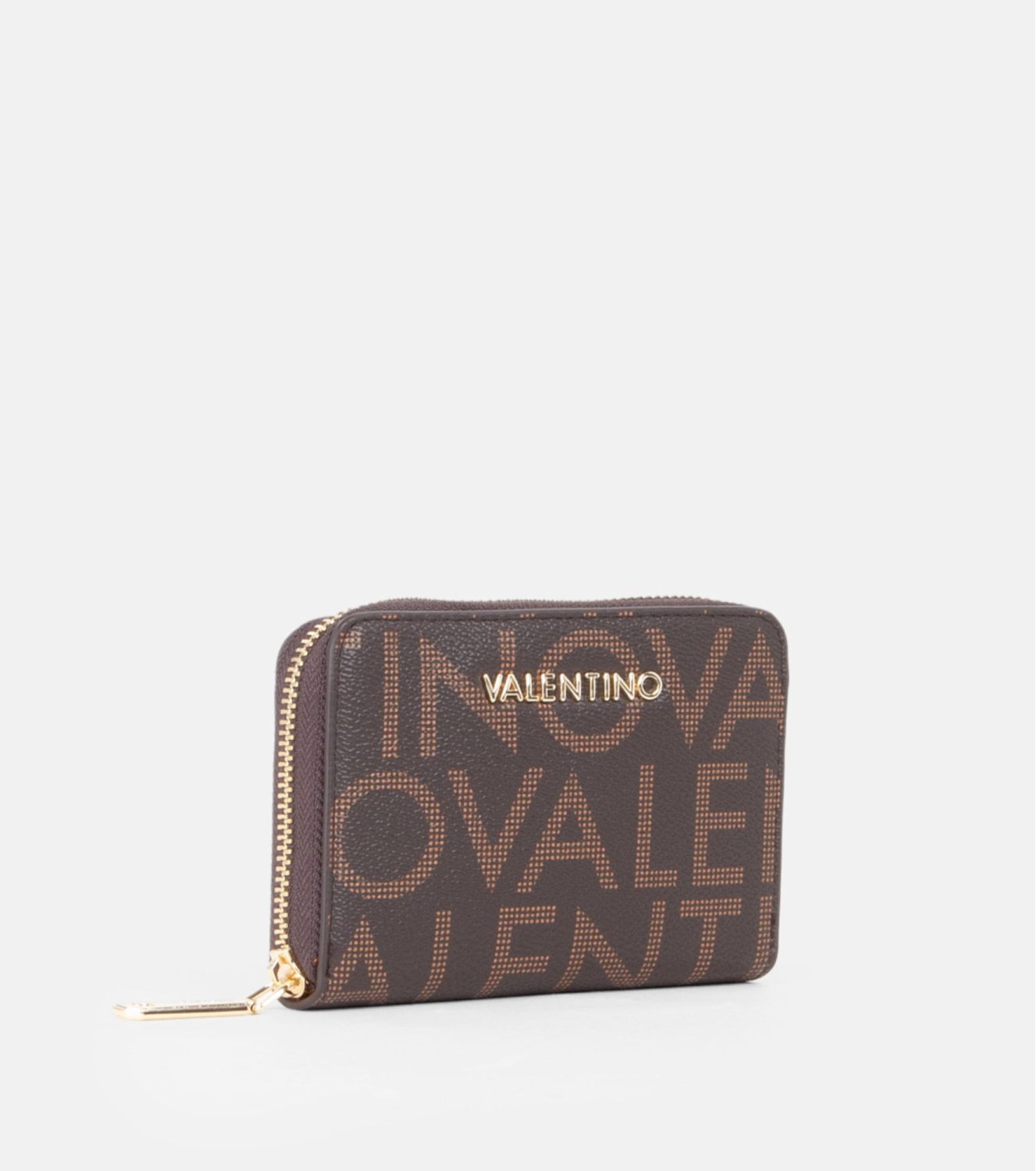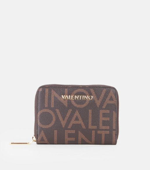 Cartera de la colección Regina RE de Valentino Bags, confeccionada en material tipo piel con el clásico estampado del logotipo en tonos marrones. Detalle metálico del logotipo en el frontal. Medidas: 9 x 13 x 2 cm.