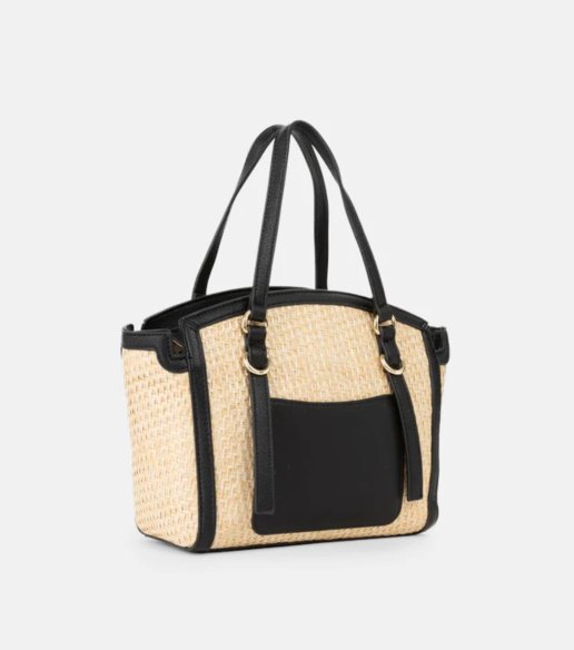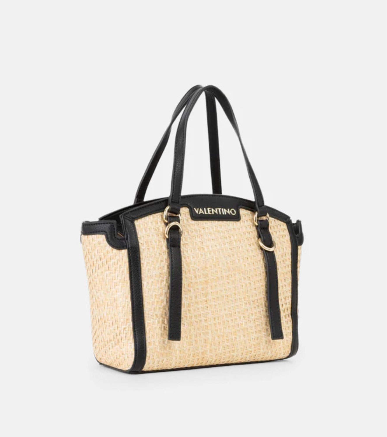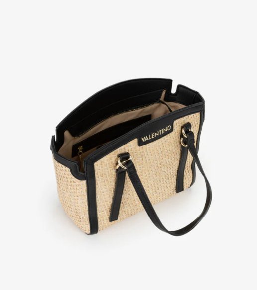 Bolso tipo shopper Valentino en tono natural con asas en negro. Hecho en tejido combinado con acabado trenzado y detalles en material sintético. Diseño estructurado con doble asa, interior organizado y cierre superior. Medidas: 21,5 x 25 x 11.